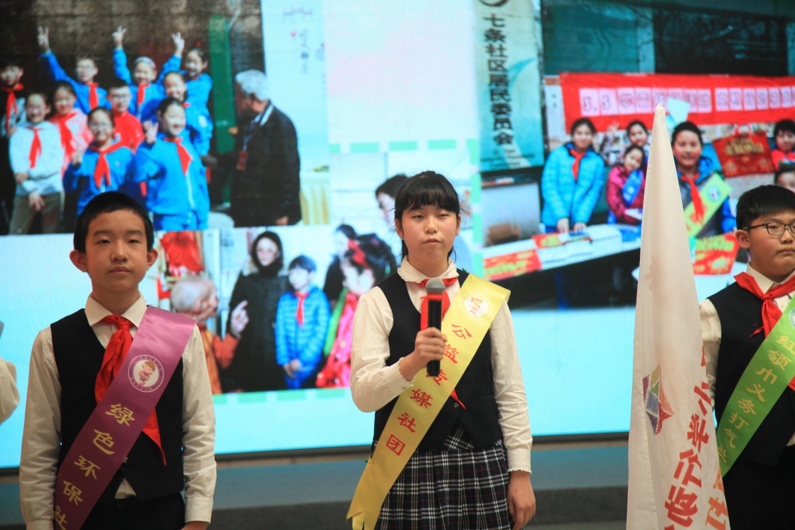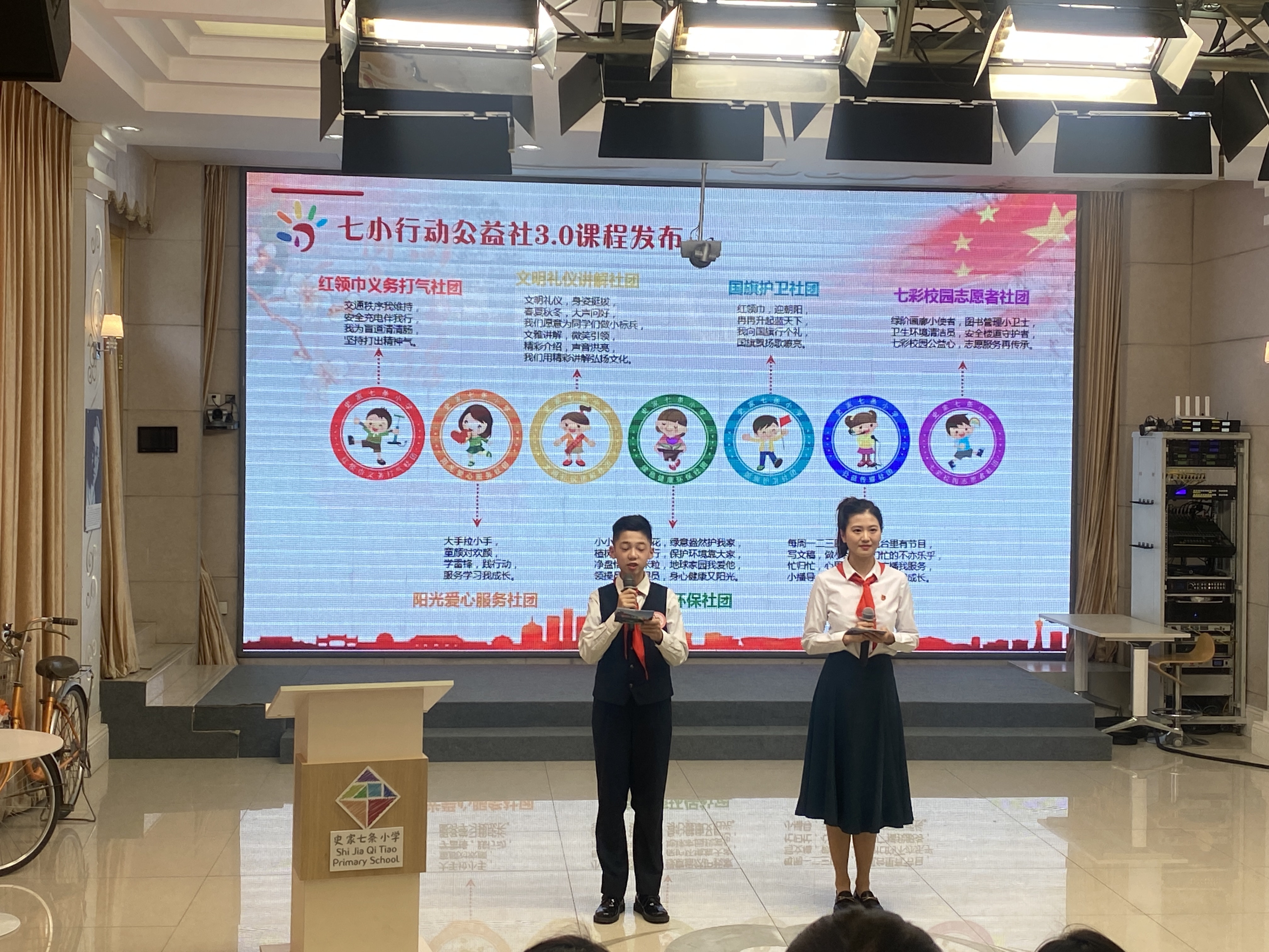 七条小学行动公益社3.0课程体系包括:红领巾义务打气社团、绿色健康环保社团、阳光爱心服务社团、公益传媒社团等七个社团。