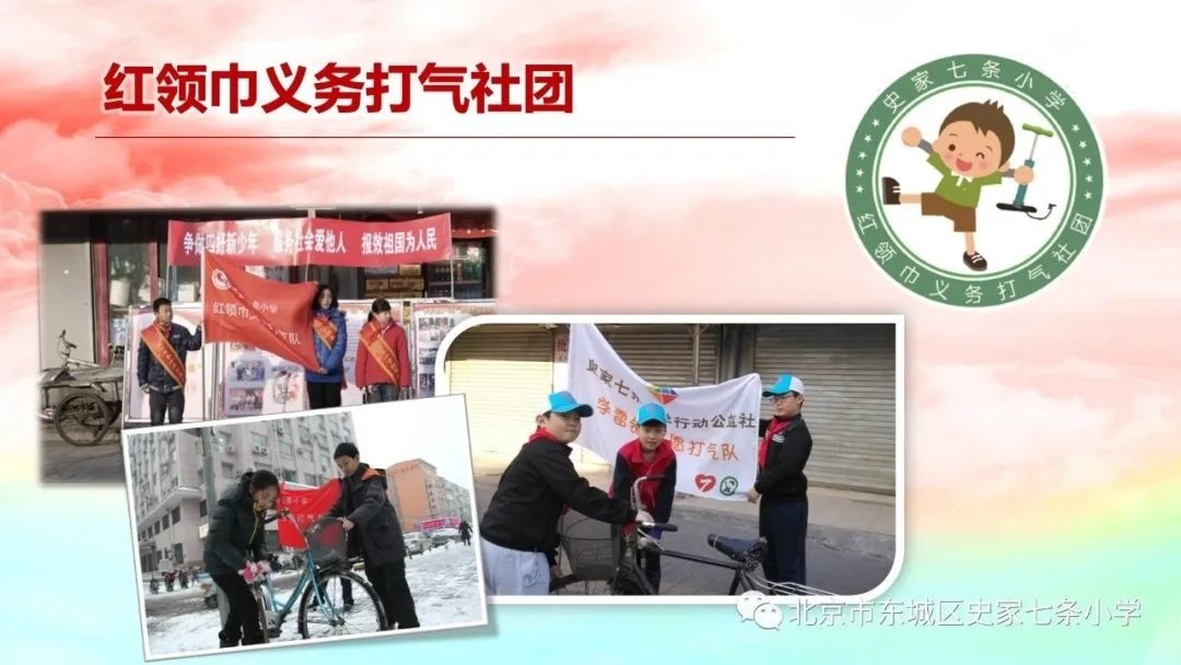 随着多年来义务打气队的坚守,时代的变迁以及教育的发展,服务形式单一的打气队也面临着自身的改革和发展。2011年3月5日,七条小学行动公益社成立了,经过十年的发展完善,七条行动公益社已经成为一个机制完善的校区公益组织,成为749名学生的公益摇篮。