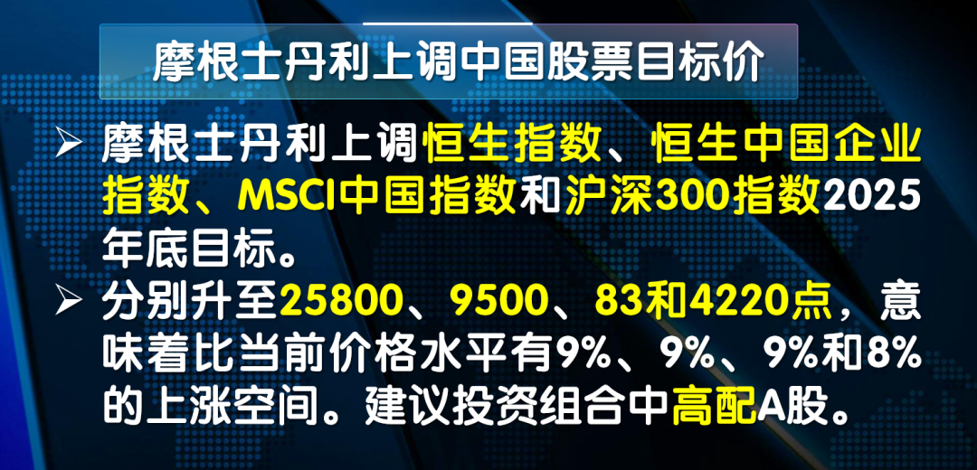 我们看到近期市场连续下跌,但外资投行却再次上调中国股票目标价格,昨天摩根士丹利上调恒生指数、恒生中国企业指数、 MSCI中国指数和沪深300指数的2025年底目标分别至25,800、9,500、83和4,220点,分别意味着比当前价格水平有9%、9%、9%和8%的上涨空间。建议投资组合中高配A股。