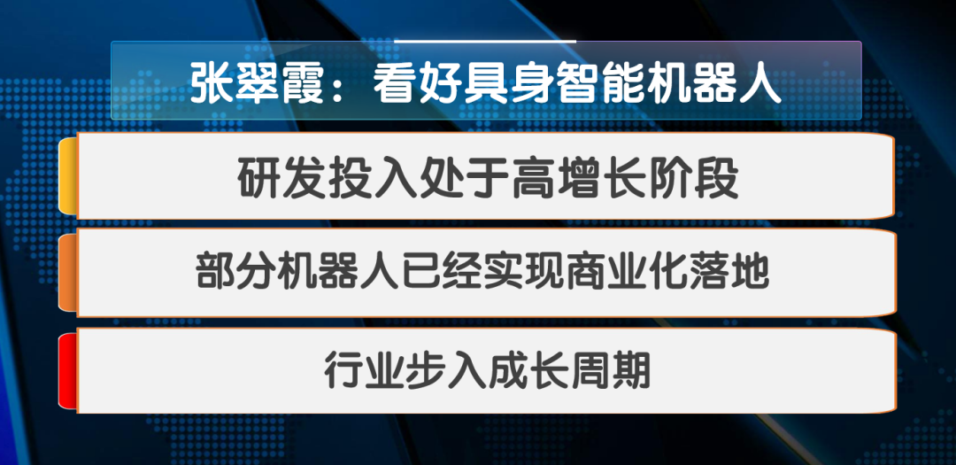 现场嘉宾张翠霞表示,看好具身智能机器人: