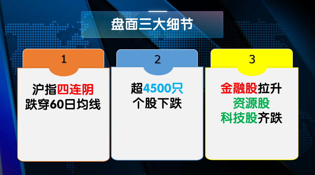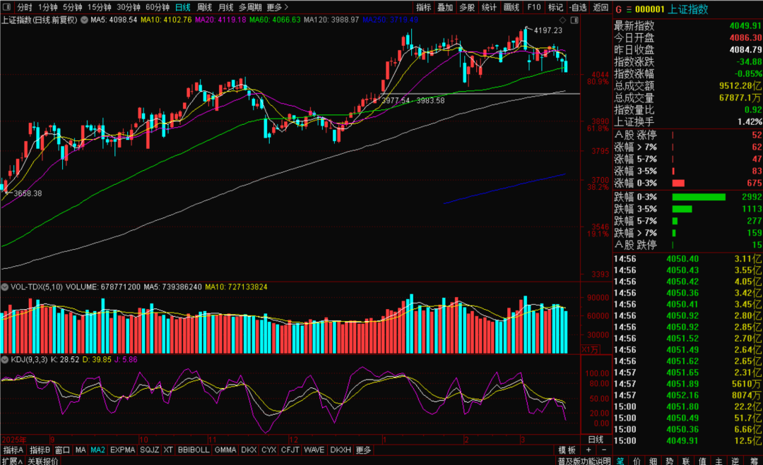 大盘已经三次单针探底,都说事不过三,就在大家期待反弹的时候,结果今天再次下探4050点,并且是2026年以来首次跌穿60日均线。全市超4500只个股下跌。保险、银行、券商、地产等蓝筹股表现活跃,科技股全线走弱。