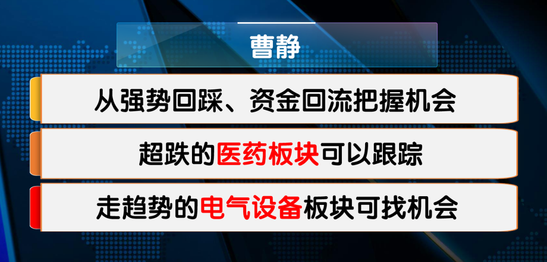 现场嘉宾曹静表示,医药板块可以跟踪、电气设备板块可找机会: