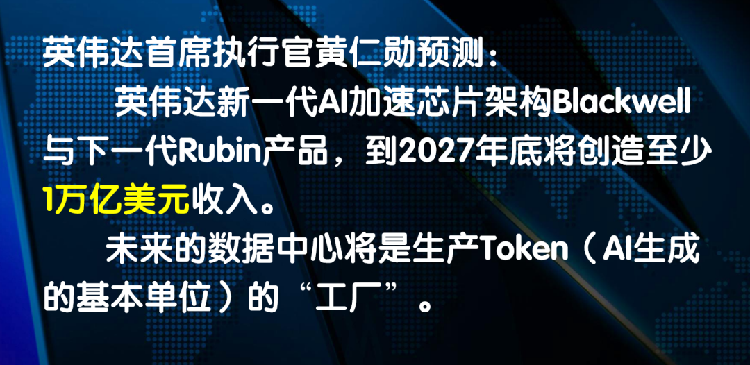 消息面:英伟达首席执行官黄仁勋预测,英伟达新一代AI加速芯片架构Blackwell与下一代Rubin产品,到2027年底将创造至少1万亿美元收入。未来的数据中心不再是存储文件的仓库,而是生产Token(AI生成的基本单位)的“工厂”。
