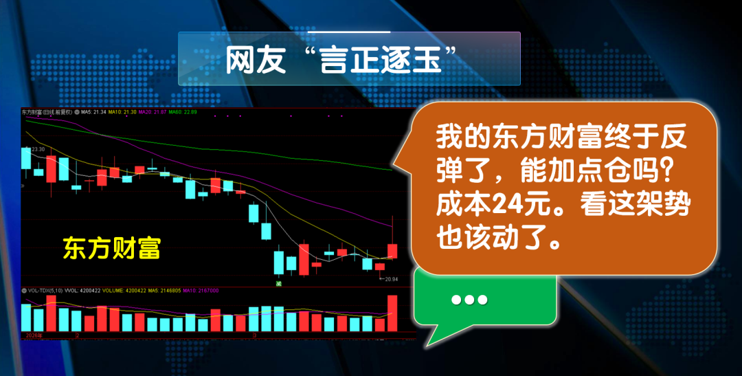 网友“言正逐玉”留言:我的东方财富终于反弹了,能加点仓吗?成本24元。看这架势也该动了。