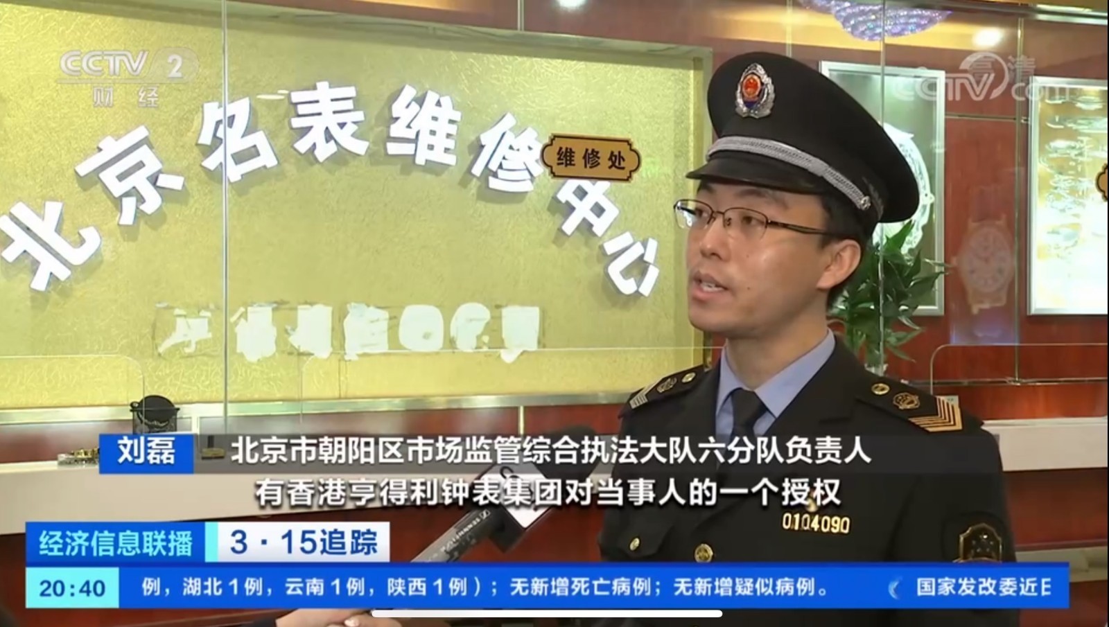 北京市朝阳区市场监管综合执法大队 六分队负责人 刘磊:当时在它的接待处的后墙上,有香港亨得利钟表集团对当事人的一个授权,授权有限期是2019年5月到2029年5月,也就是十年,但是经我们通过香港投资推广署的网站查询,香港亨得利钟表集团这家公司在2019年3月份就已经注销了,还有一个这个香港这家亨得利钟表集团和我们日常熟知的亨得利是不一样的,它也是非正牌的,这样产生了一个误导消费者的效果。