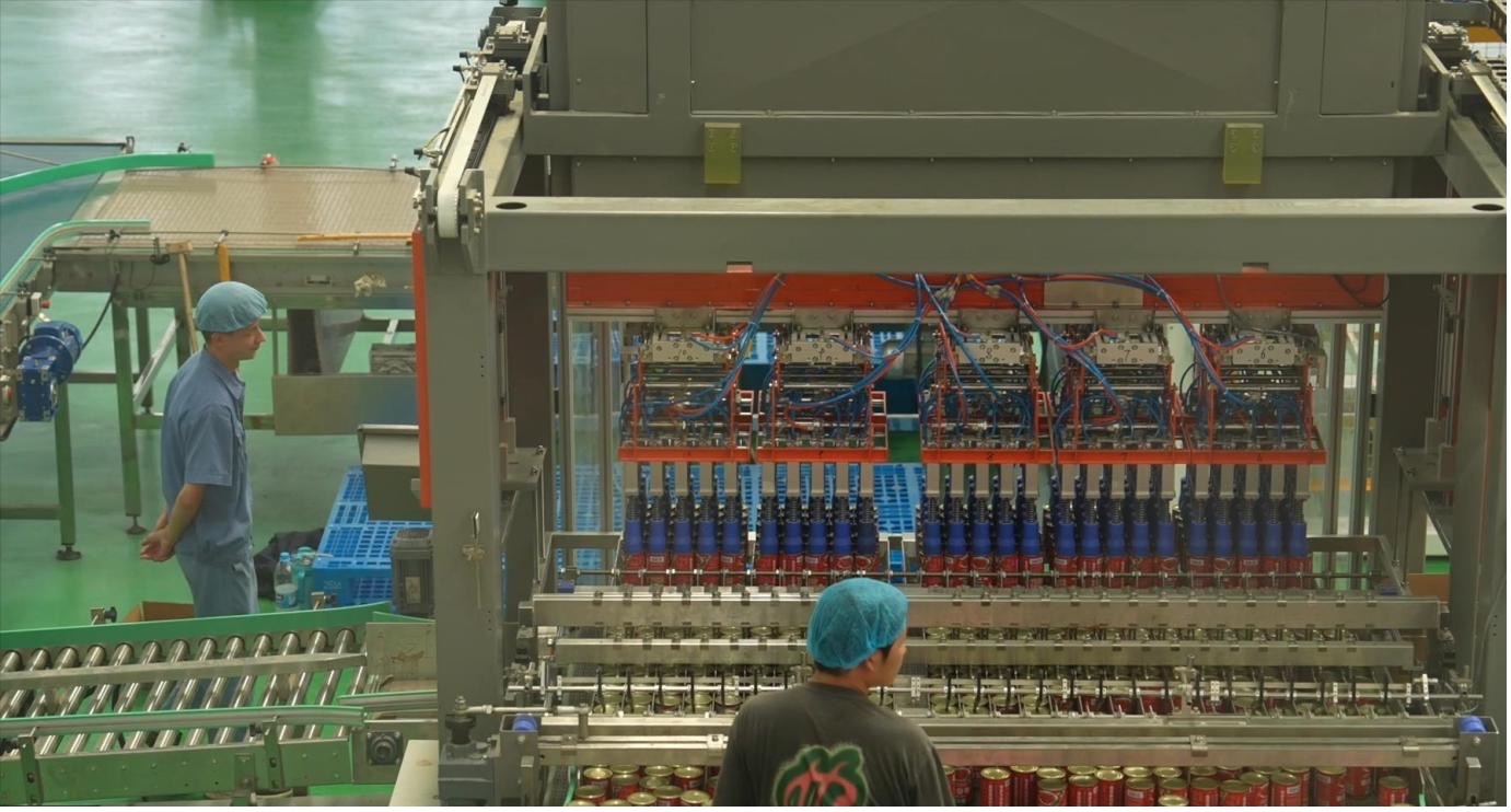 装罐先装番茄丁,再加入果泥,让罐头更浓稠。质检人员会随机抽查,确保固形物比率高于60%。最后采用“水浴灭菌”技术,先是近100度的高温池,再是30度的低温池浸泡,冷热交替使得罐头内部形成真空环境,助其拥有长达2年的保质期。