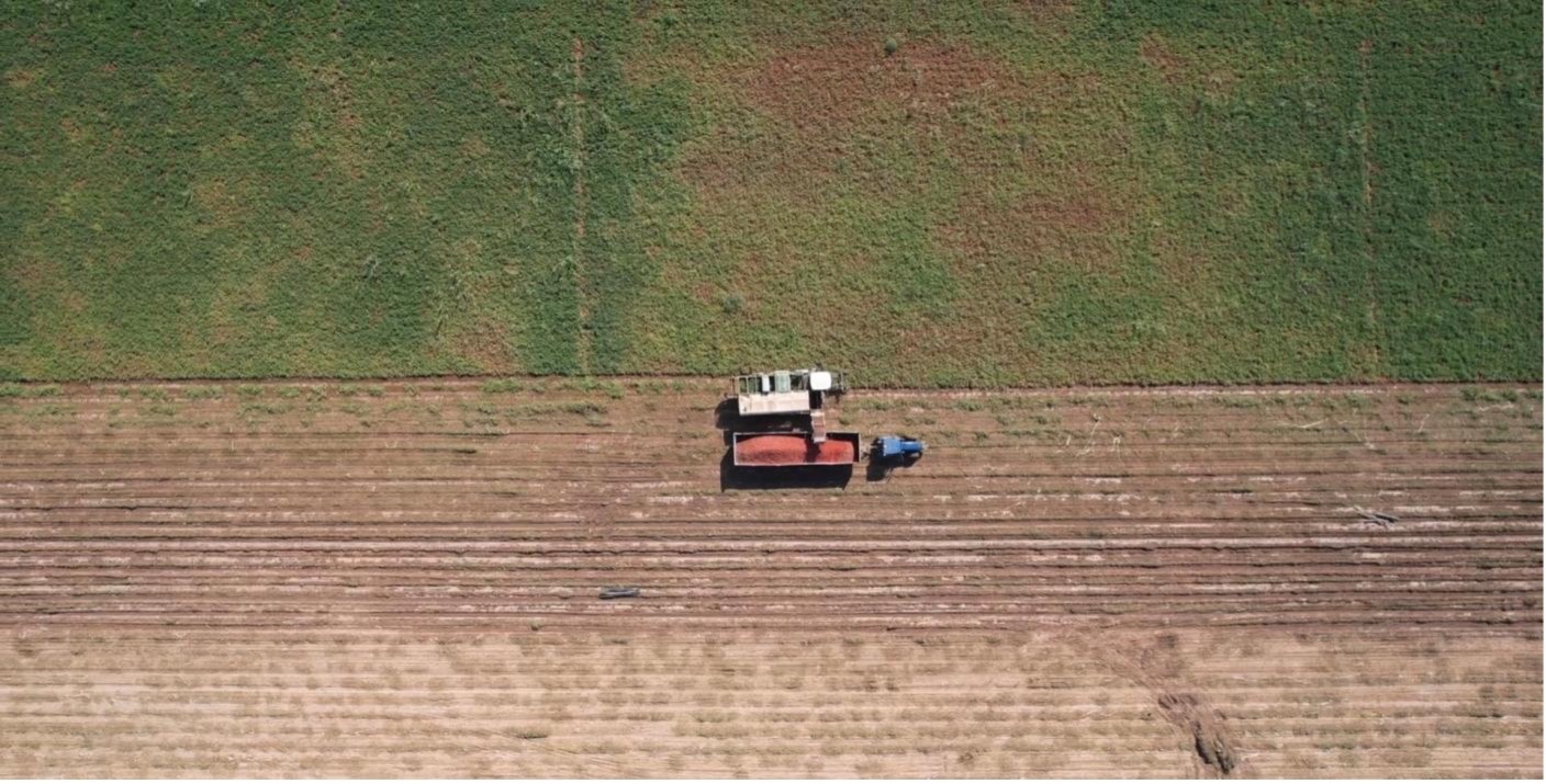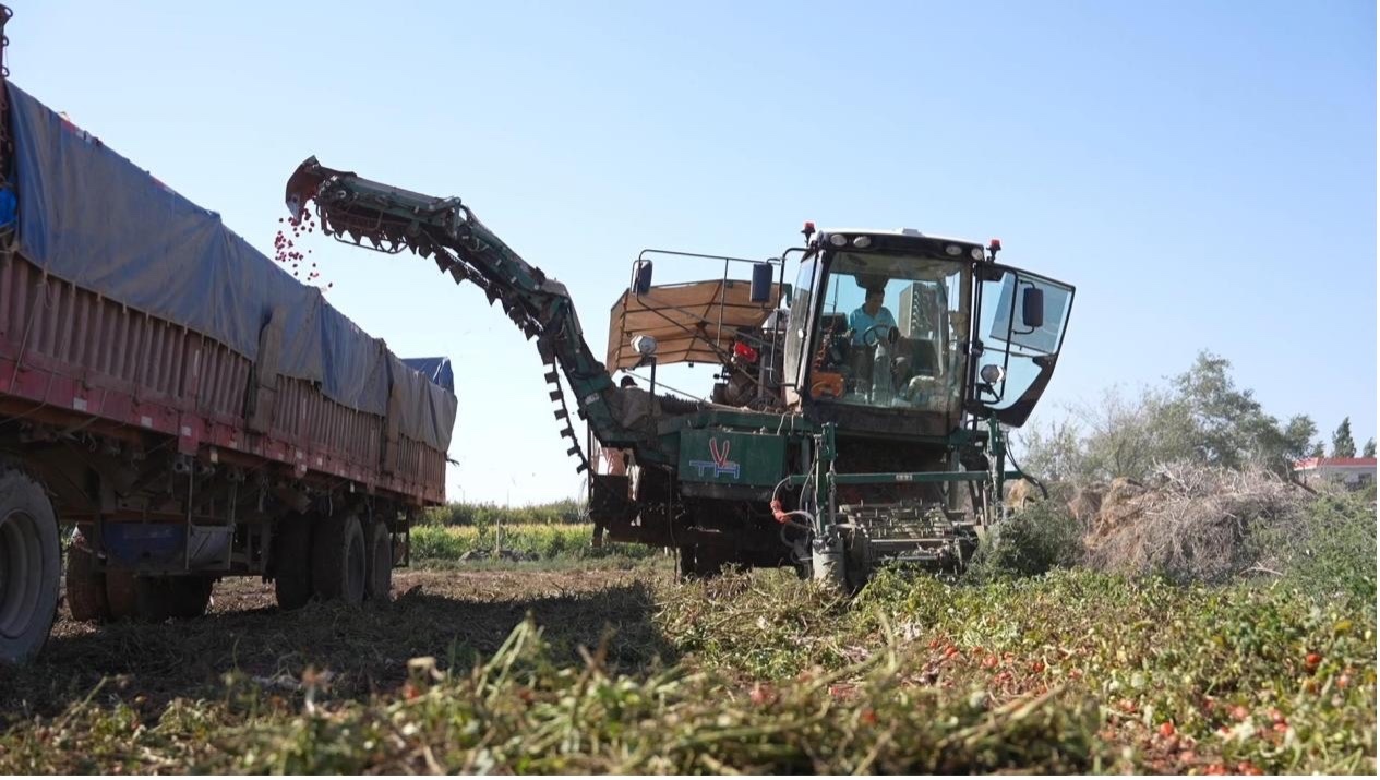 8、9月份正值昌吉番茄成熟,312国道两旁的农田里,大片加工番茄静静等待采收,每株番茄大概会结40—100颗果子。自动采收机在田里一趟趟忙碌,旁边等待着的大卡车一装满就会立即拉到工厂。这些卡车常年穿梭于两处,被压出的番茄汁流到路上,在地上留下两道深深的印记。