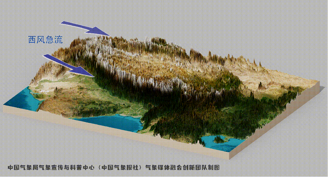 当地形相对小且孤立时,会影响其周边局地降水的分布;而当地形尺度很大时,则会改变更大范围的天气系统背景。青藏高原是典型的大尺度地形,它直接影响了整个纬度带上全球降水的分布。例如冬天时,青藏高原作为冷源,其南侧的温度梯度加强,导致南支的西风急流加强,在我国的昆明、贵阳与南下的冷空气相遇,形成昆明准静止锋,进而使得四川、云南、贵州一带更容易出现降水。