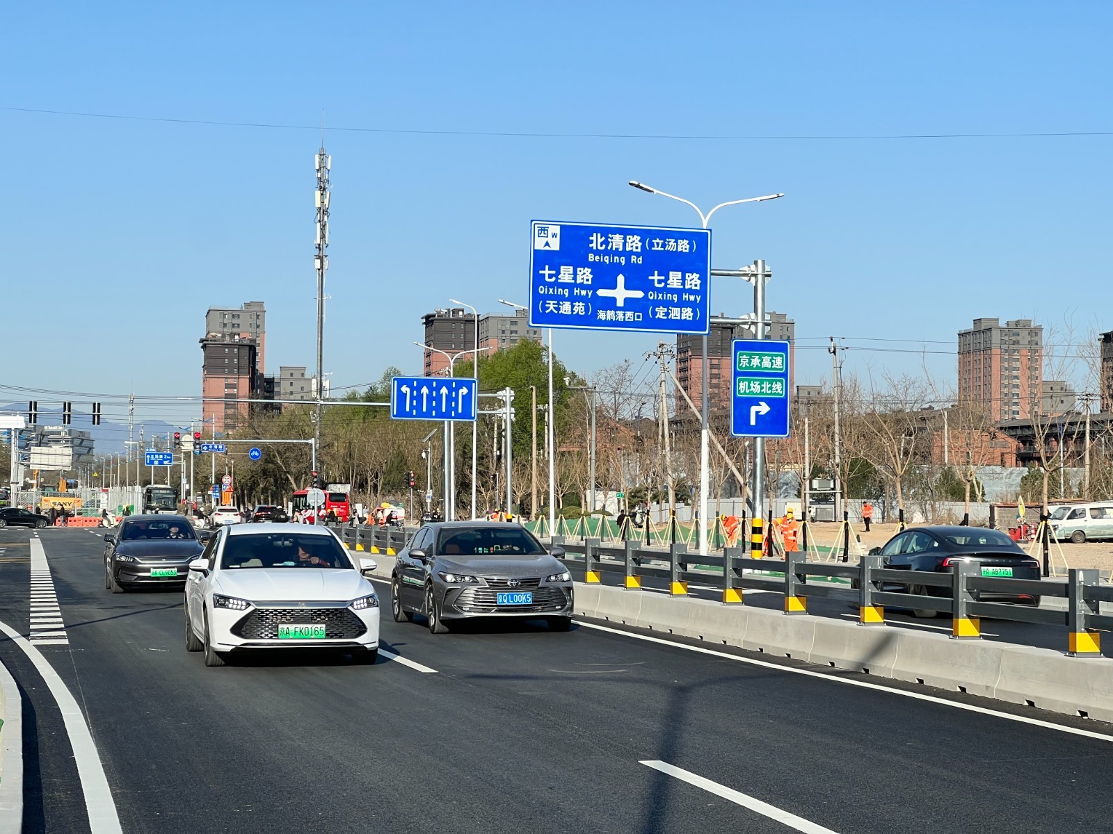 北京市交通委员会昌平公路分局工程管理科科长聂雪峰介绍,“根据统计,这个路口早晚高峰每小时接近有千余辆车经过,之前市民要么经北侧定泗路绕行1.6公里,要么经南侧七北南路绕行0.5公里,其中定泗路作为主干道本身承载的交通量就很大、极易拥堵,七北南路只有一上一下两车道,也无法起到分流如此大规模车流的作用,市民通常要在这里堵二三十分钟。得益于北七家镇、未来科学城的前期协调推进,我们在满足安全通行条件的基础上第一时间开放了交通,两上两下四条机动车道以及两条独立的非机动车道能够更好满足市民出行需求。”