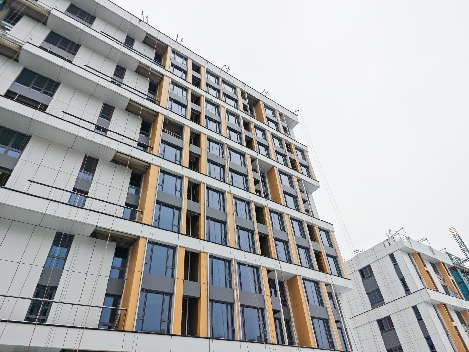 记者在现场看到,位于1、2号地块的6栋住宅楼中,4栋为40平方米的开间,2栋为110平方米的三居室,橙白两色拼接的铝板幕墙干净大气。