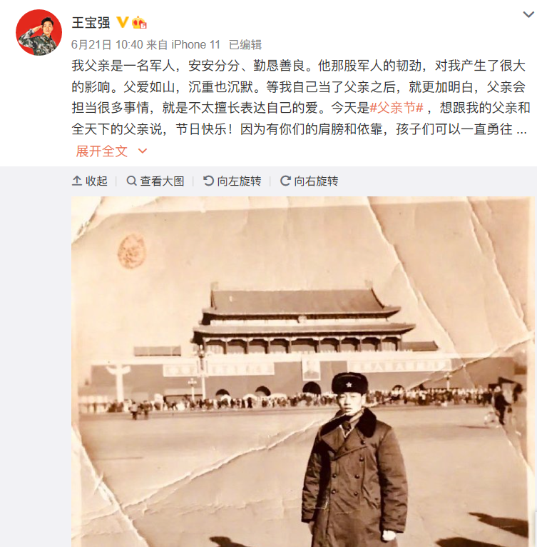 事实上,除了张译,“突击团”中的王宝强和李晨也与军人有着不解之缘。今年父亲节,王宝强在社交平台上传了一张父亲的帅照,年轻的王爸爸身穿厚厚的军大衣,在天安门前留影。王宝强的配文有感而发:“我父亲是一名军人,安安分分、勤恳善良。他那股军人的韧劲,对我产生了很大的影响。”