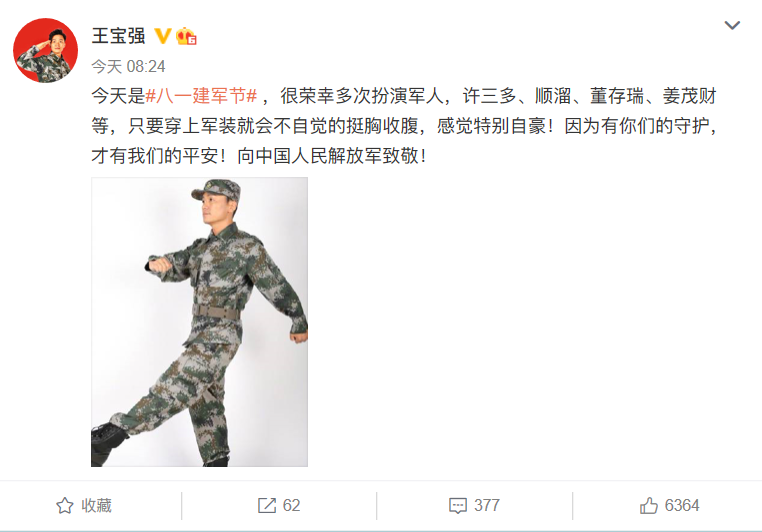 凭着“兵王许三多”一角深受大众喜爱的王宝强,也上传了一张穿军装踢正步的照片。他的演艺生涯与军旅题材密不可分,曾多次在荧屏中以军人角色亮相。他表示:“很荣幸多次扮演军人,许三多、顺溜、董存瑞、姜茂财等,只要穿上军装就会不自觉的挺胸收腹,感觉特别自豪!因为有你们的守护,才有我们的平安!向中国人民解放军致敬!”
