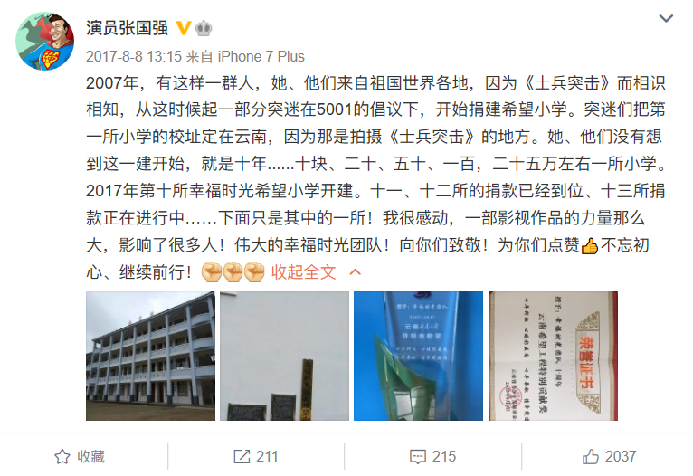 “他们没有想到这一建开始,就是十年……十块、二十、五十、一百,二十五万左右一所小学。2017年第十所幸福时光希望小学开建。十一、十二所的捐款已经到位、十三所捐款正在进行中……下面只是其中的一所!”张国强充满自豪地对外分享了这些“突迷”为公益事业的长期贡献,他感叹道:“我很感动,一部影视作品的力量那么大,影响了很多人!”【资料参考:北京青年周刊、中国军网等】