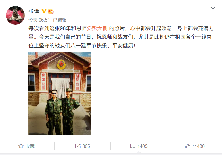 建军节一早,张译发文向军人送上祝福
