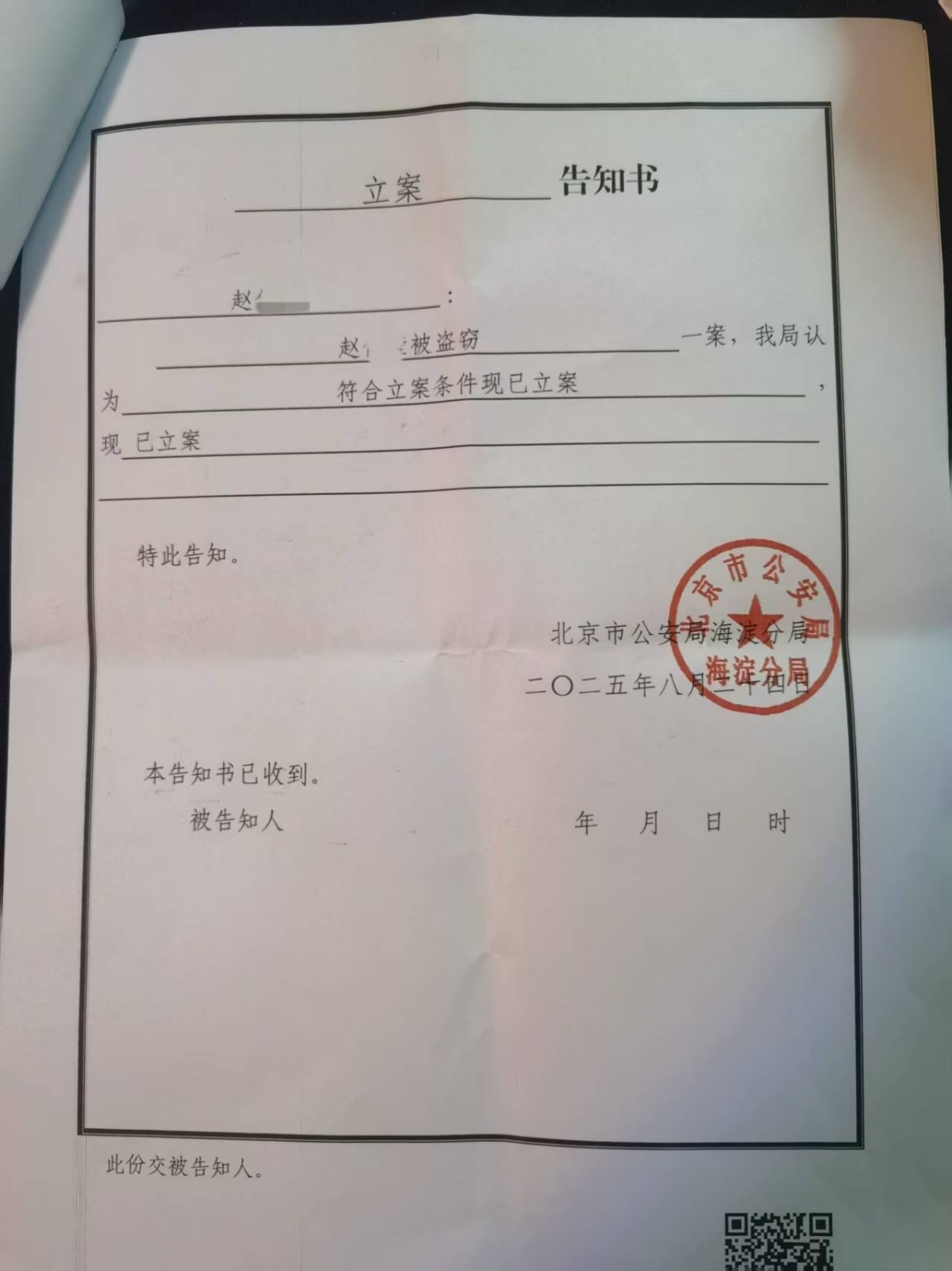 北京市公安局海淀分局出具的立案告知书显示,警方当天就对这起盗窃案进行了立案。