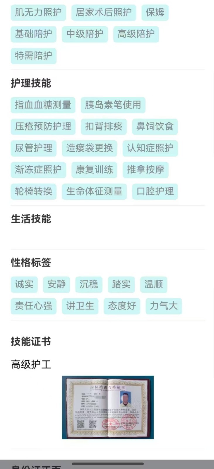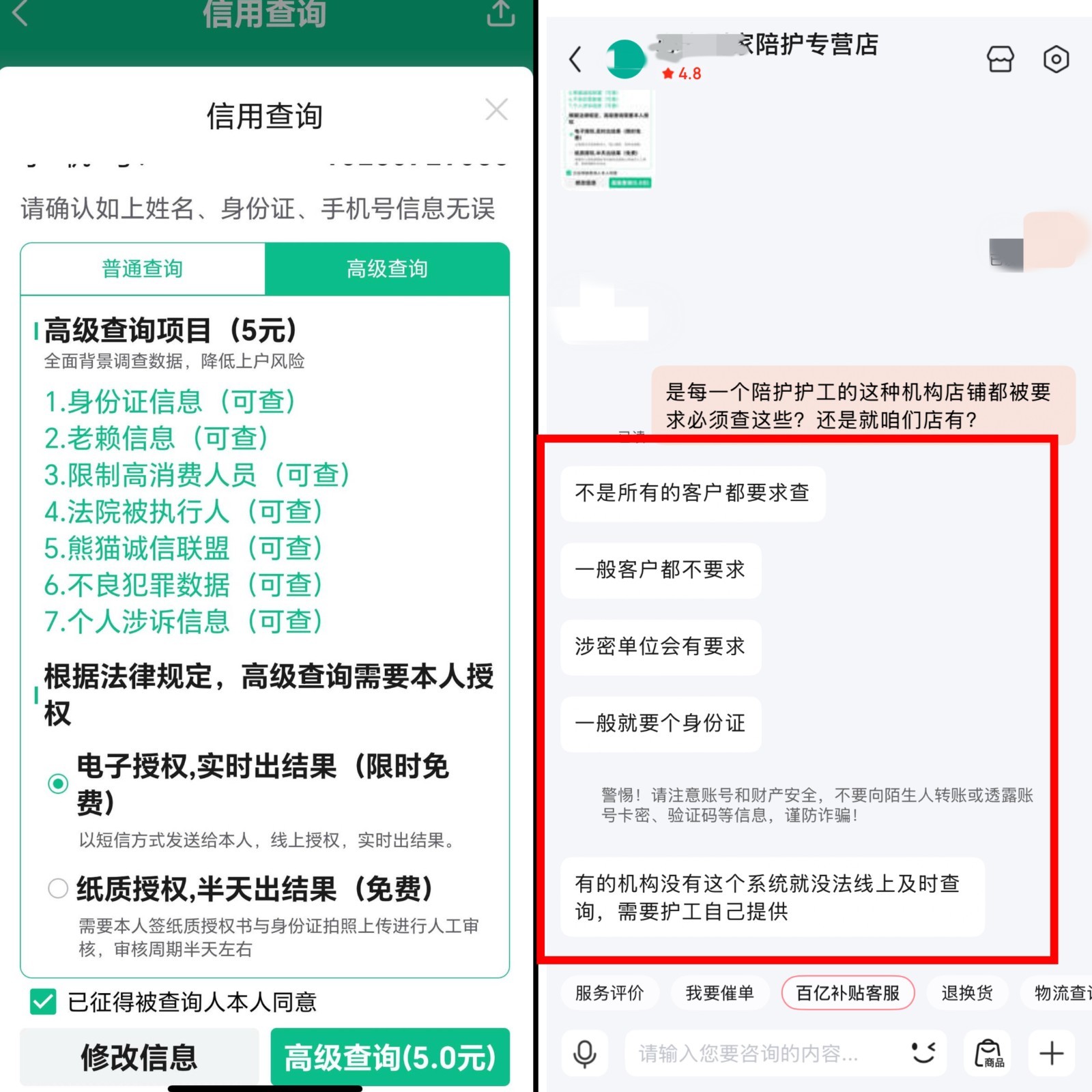 “问北京”记者注意到,该店铺宣传中写有该店护工会通过四大认证、岗前培训、员工考核,店铺会层层把关、严格考验、全方位排查个人信息、服务全程指导。对此,记者进一步咨询了解到,“四大认证”包括护工的身份证、健康证、护工证、上岗证。对于特别提出需求的客户,店铺也可以出示护工的征信查询信息,甚至可以与客户线下当面查验,查验范围包括老赖信息、限制高消费人员信息、不良犯罪数据等。但这名客服表示,实践中,并非所有的客户都会要求查,也并不是所有的护工服务机构都具有提供查询的能力。
