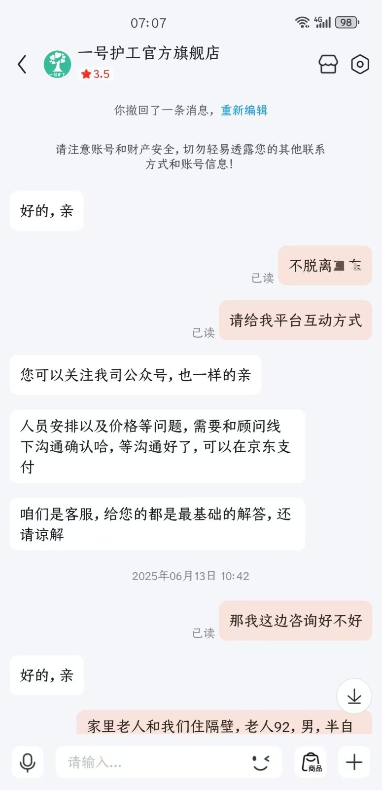 时间倒回到今年5月,一天夜里忽然摔倒后,那个年轻时曾当过国家二级运动员的父亲,变成了严重失能老人。赵女士随即在自己经常购物的国内某知名电商平台搜索护工信息,并搜到了专门提供照护服务的“一号护工旗舰店”,咨询后,经由店内顾问李女士(化姓)介绍,以每月6800元的价格聘请王某照顾父亲。