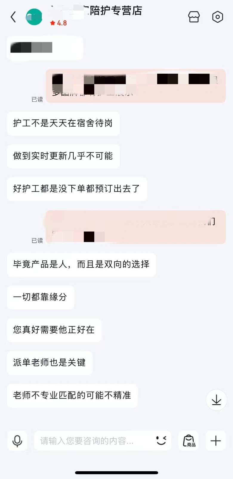 记者随机咨询一家评分4.8分的陪护专营店