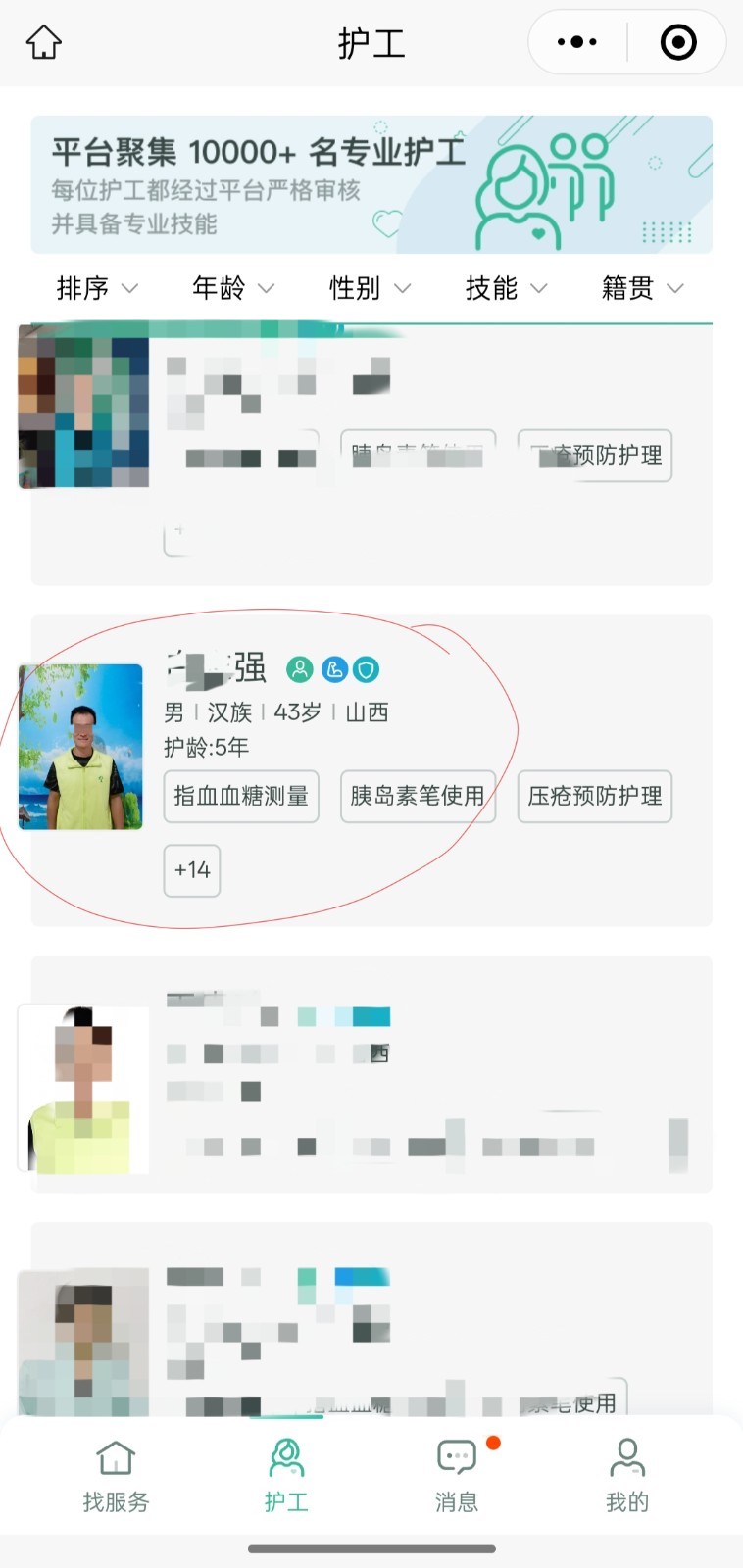 “一号护工”小程序上的护工招聘和护工入驻截图