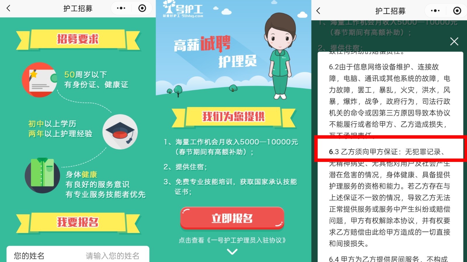 “问北京”记者在“一号护工”微信小程序护工招募页面看到,进行报名时,《一号护工护理员入驻协议》要求护理员“无犯罪记录”。