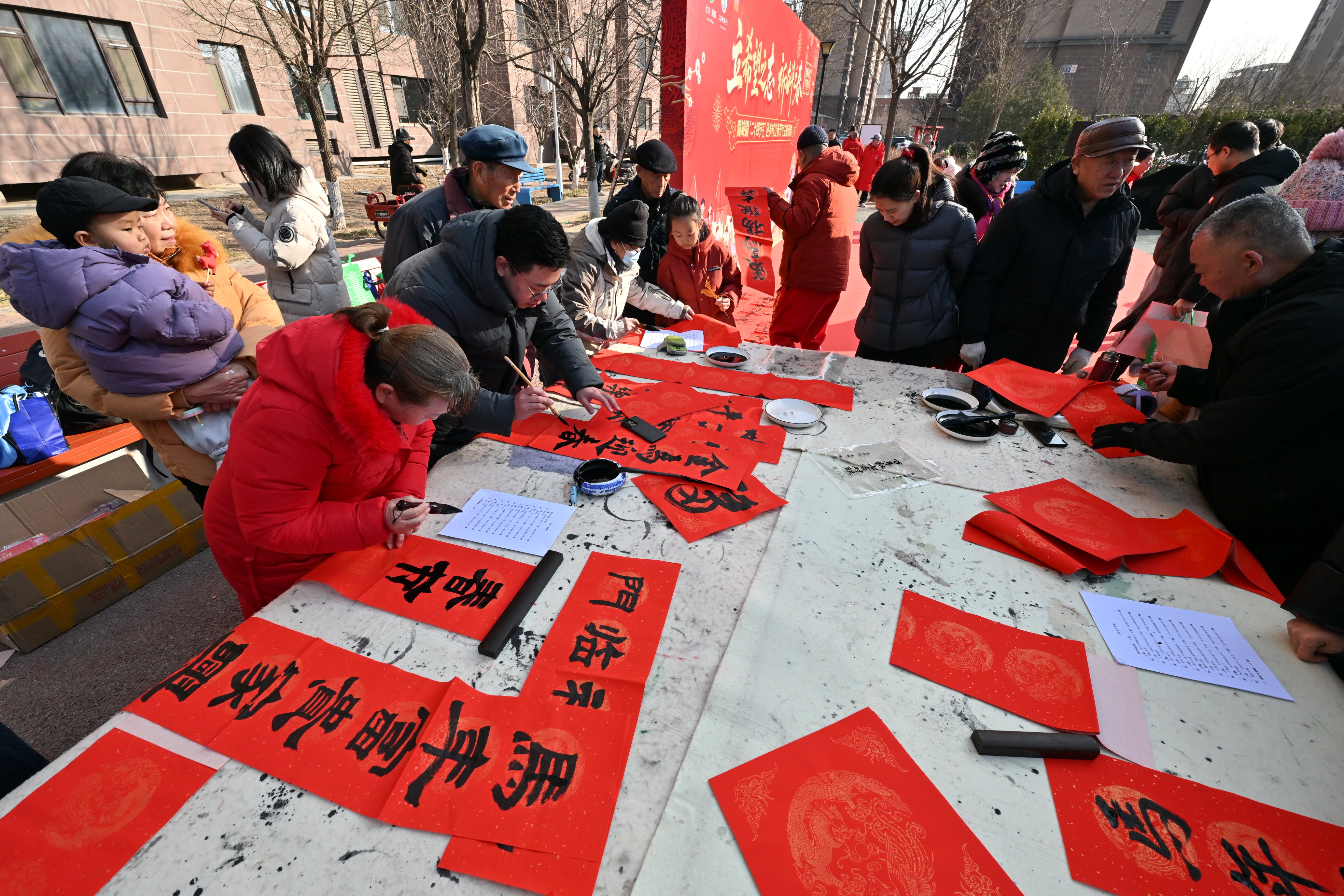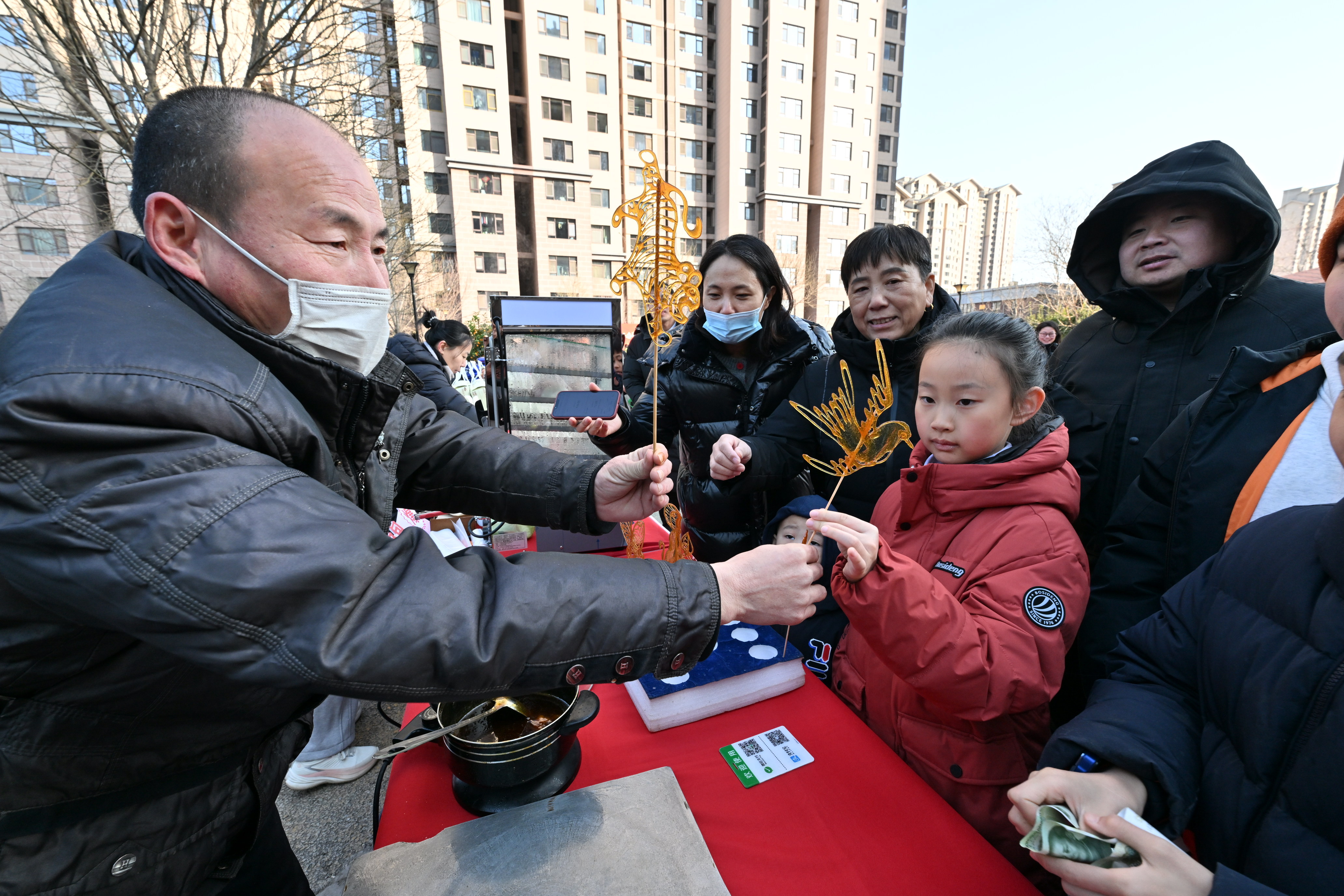 现场还设置了文化体验区,画糖人、捏面人、皮影戏、写春联等项目与手工艺展示,也吸引了不少居民参与。