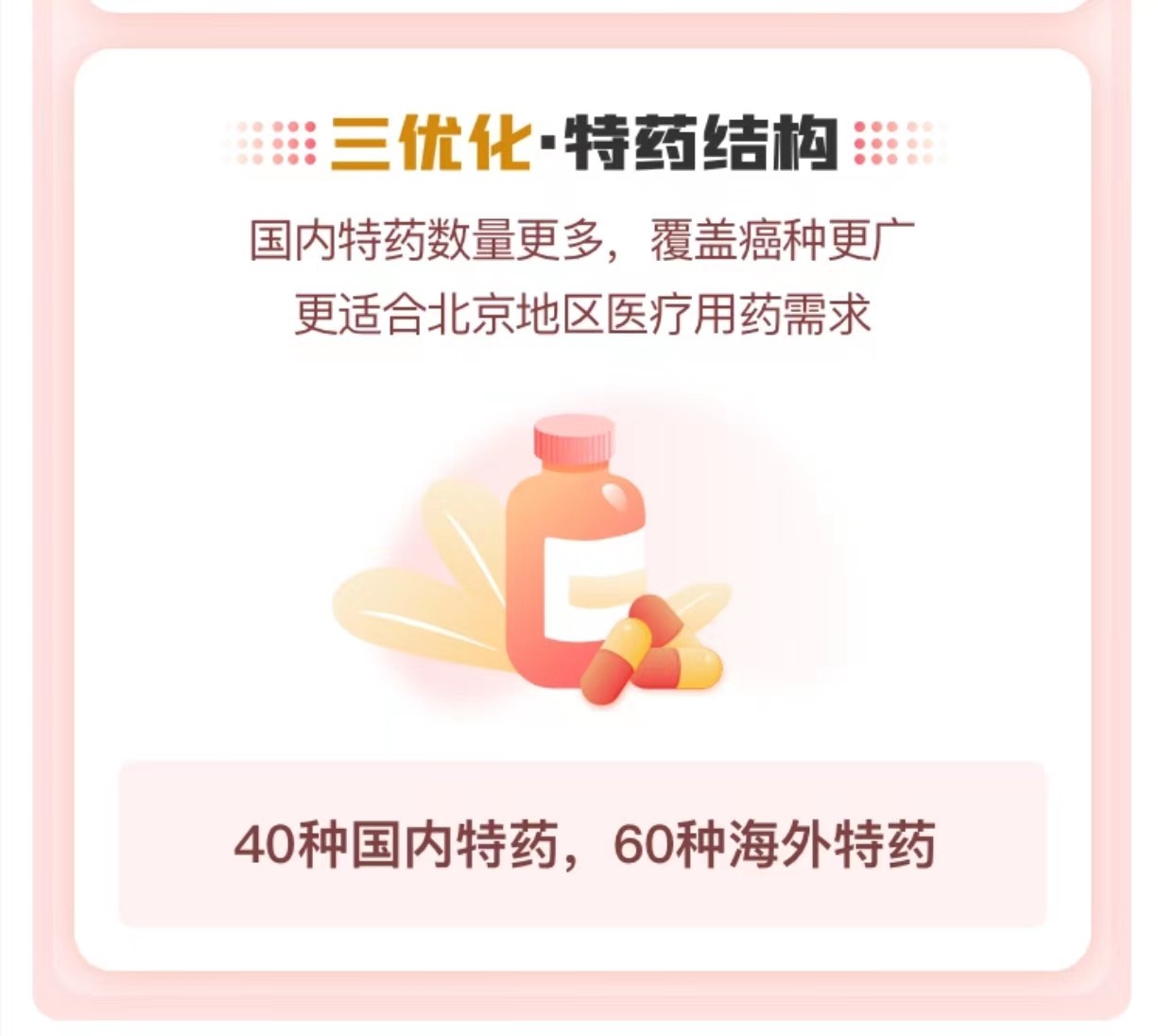 ◇降低免赔额,优化了特药服务,国内特药数量更多,覆盖癌种更广,更适合北京地区医疗用药需求