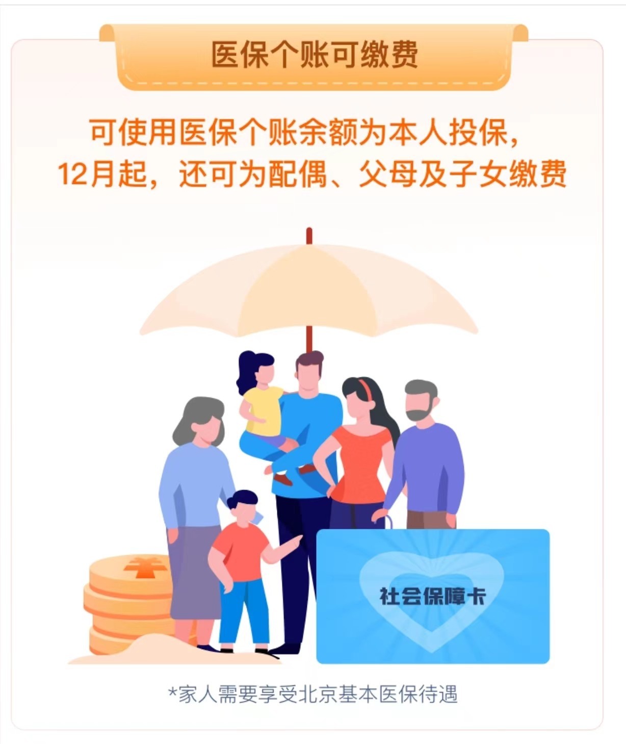 ◇ 12月起,在医保账户完成共济对象办理后,可使用医保个账余额为可以享受北京市基本医保待遇的配偶、父母及子女参保缴费。