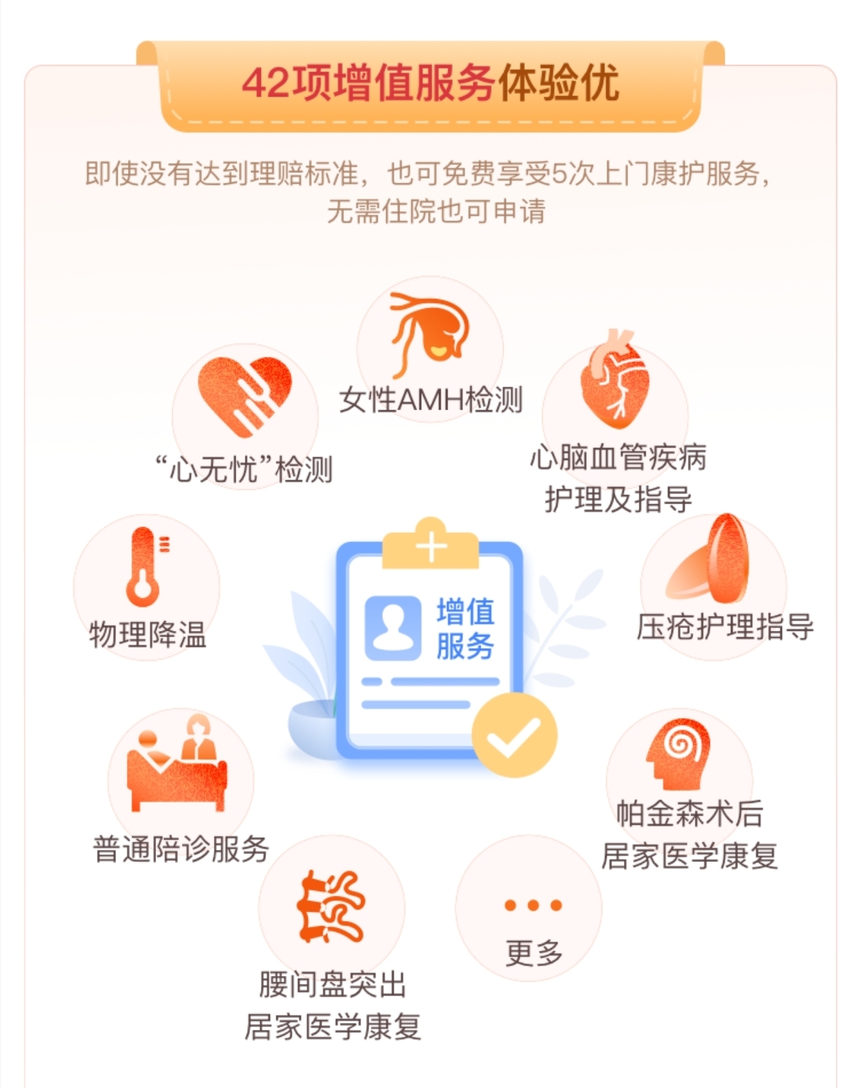 ◇ 42项增值体验服务,即使没有达到理赔标准,也可以享受5次上门康护服务