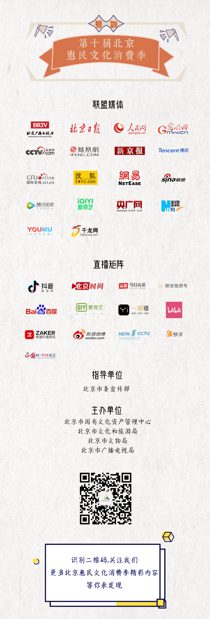 第十届北京惠民文化消费季聚焦新技术、新场景、新模式、新空间、新业态,引聚优质资源,以“20余项主体活动引导+400余项精品市场活动协同”的双线融合活动体系,共同点燃首都文化消费盛宴、点亮群众文化消费生活。广大市民可通过北京惠民文化消费季官方订阅号、“京彩culture+”官方小程序了解更多精彩活动信息。