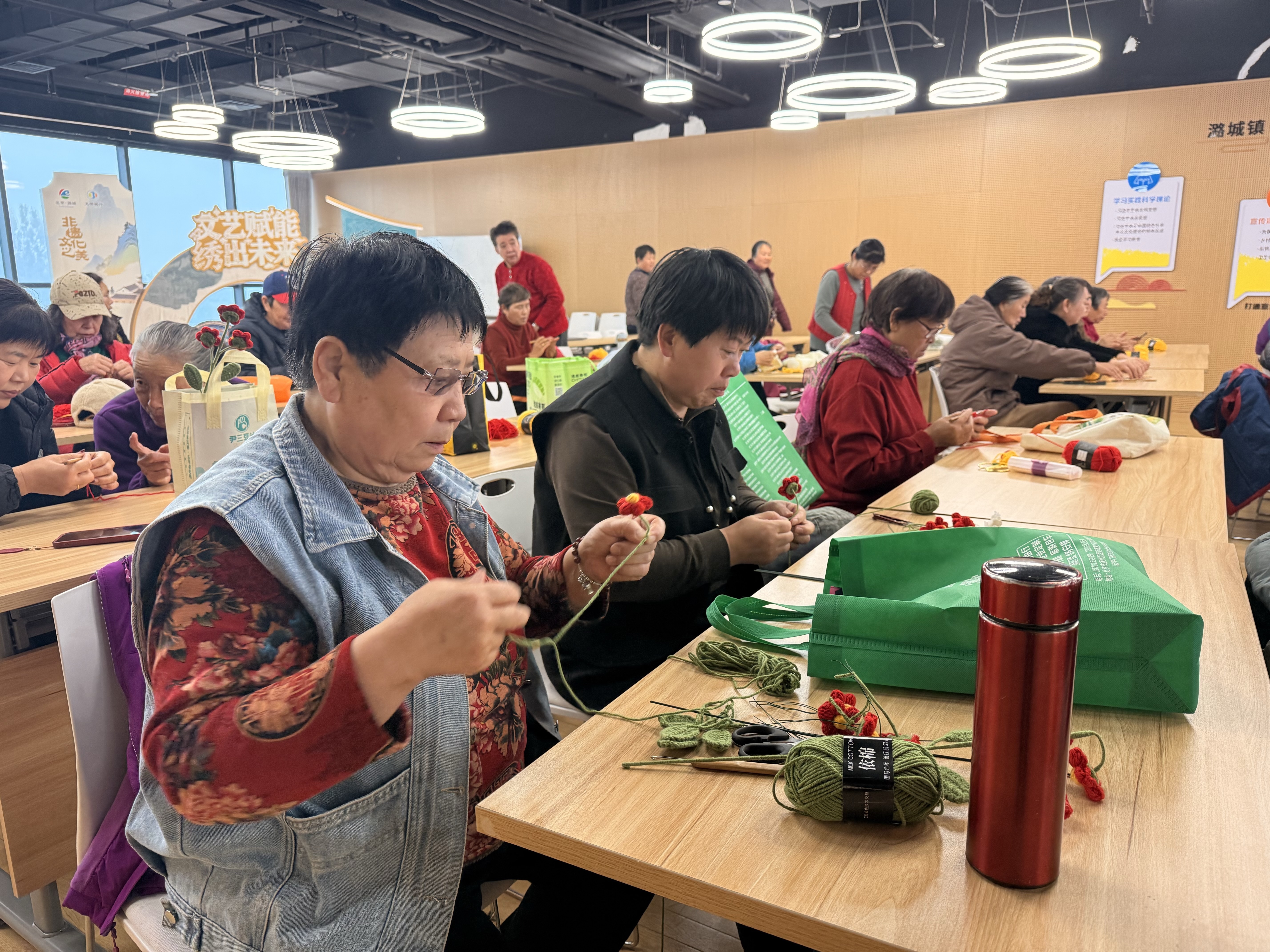 “以前总羡慕别人会钩针,现在有老师教,终于能亲手做些有用的东西了!”拿起刚完成的小红花胸针,志愿者毛应琼脸上满是成就感。