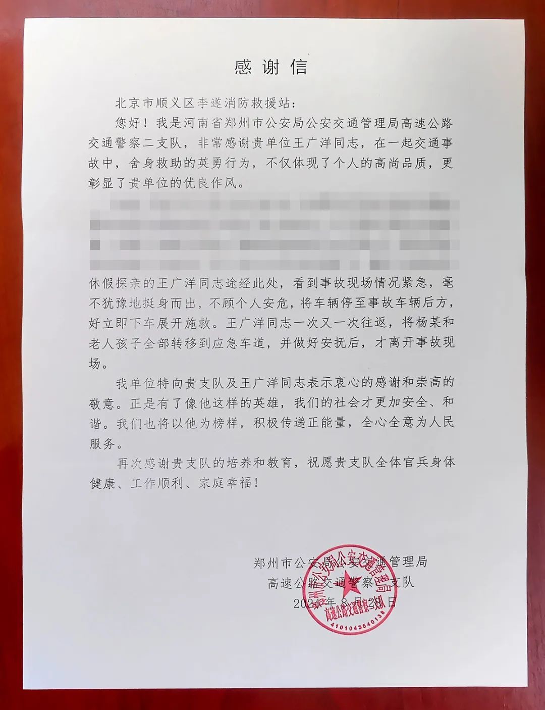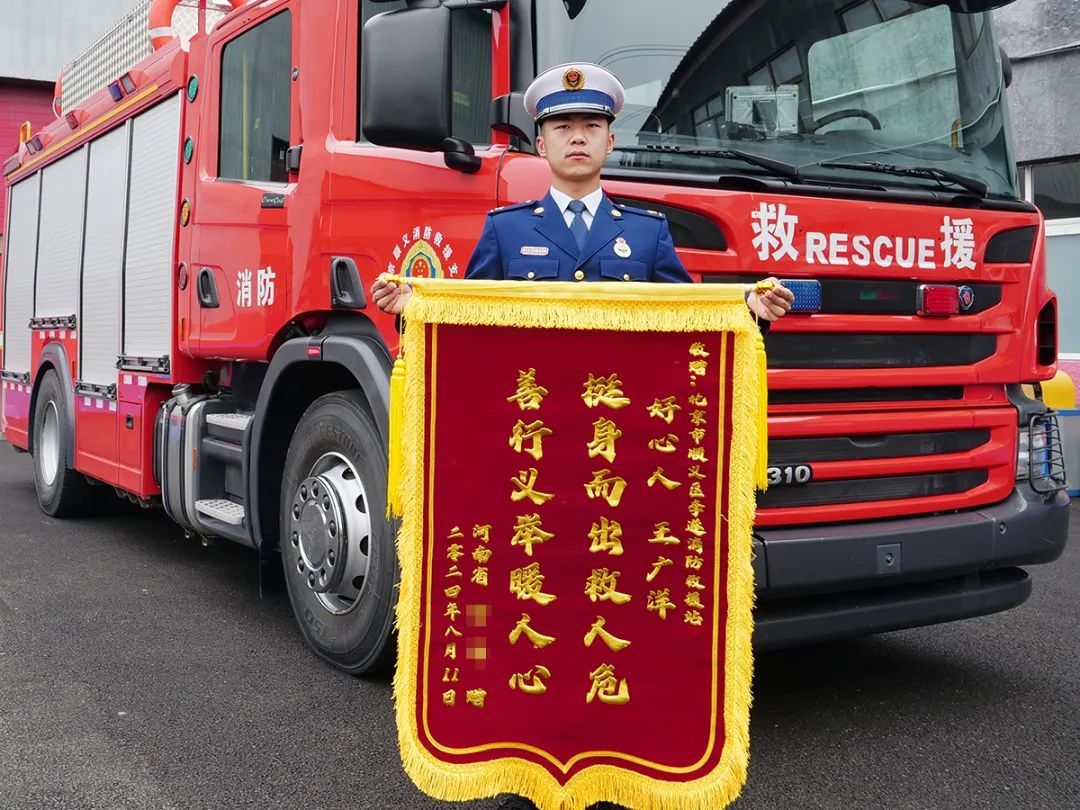 车主清醒后辗转得知,救下自己一家5口的好心人是一位北京顺义的消防员,便制作了一面印有“挺身而出救人危,善行义举暖人心”的锦旗寄到消防站,表达自己的感激之情。事后,河南郑州交警部门也专门向顺义区消防救援支队发来感谢信。