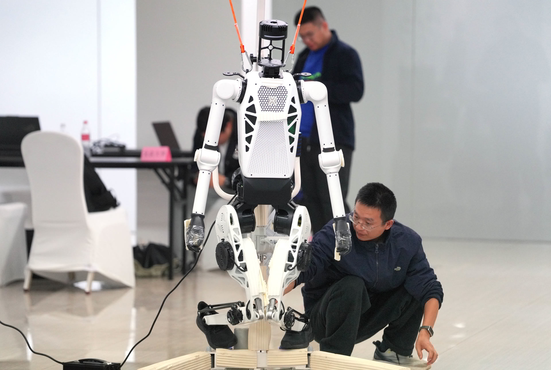 华中科技大学的博士生窦钰涵边遥控边观察机器人步态:“我们适当延长了奔跑时脚蹬地后的腾空时间,同时增大摆臂幅度,使其姿态更贴近人类中长跑的运动特征。”据悉,目前实测配速已经超过去年冠军成绩不少。被问到目标,他笑着谦虚说道:“争取冲进前十吧。”