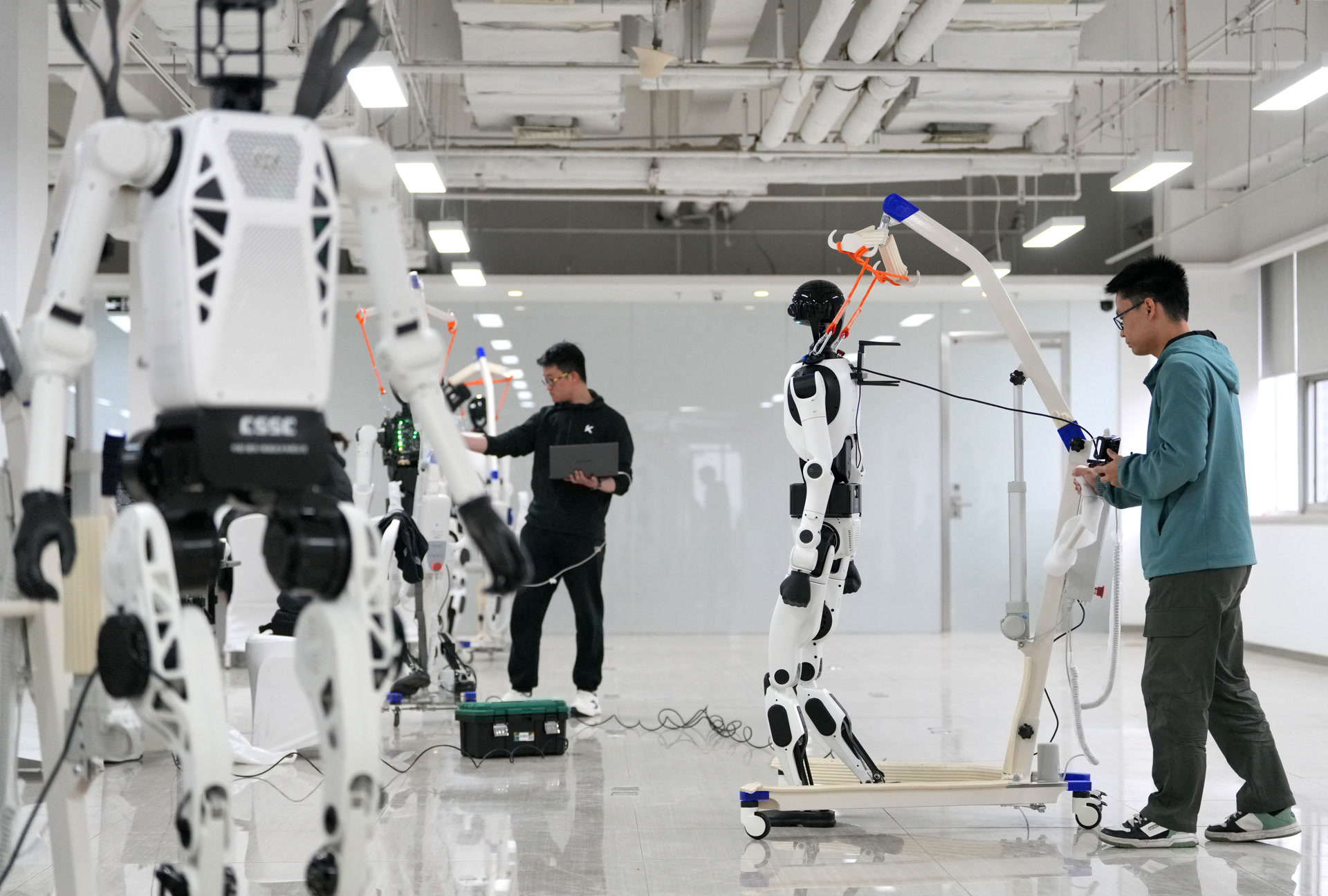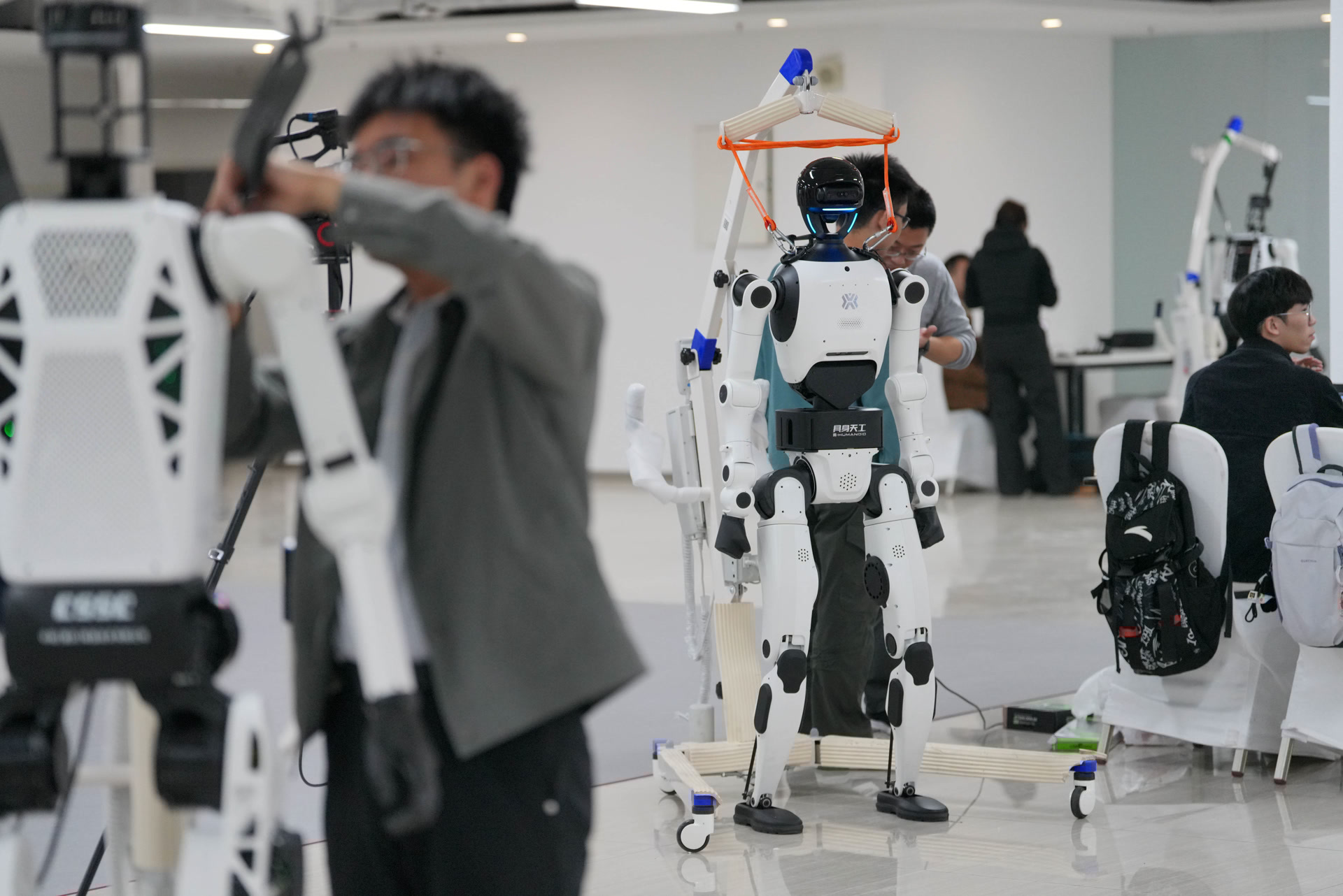 4月9日下午,在北京人形机器人创新中心开设的半马实训营内,来自多所高校的学生正围绕这些统一提供的“具身天工”系列机器人,做赛前最后的调试与算法验证。