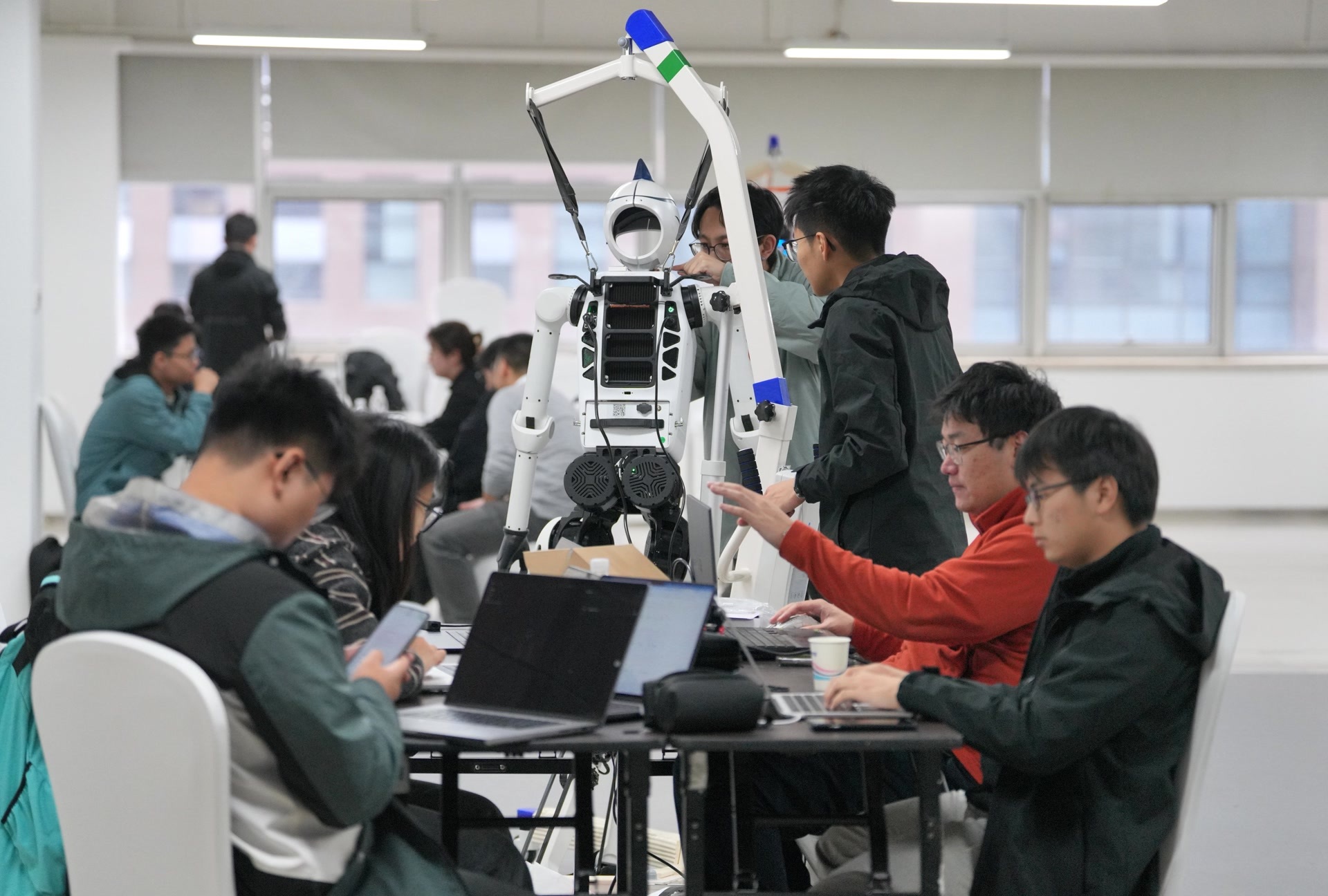 实训营大厅内,近十台黑白相间的具身天工机器人在测试场内迈步或小跑,关节电机发出细密的嗡鸣,像一群正在热身的钢铁跑者。小木桌拼成的临时工位上,一台台笔记本电脑整体摆放,一个个年轻的面孔紧盯着屏幕和机器人,做着最后的赛前准备工作。
