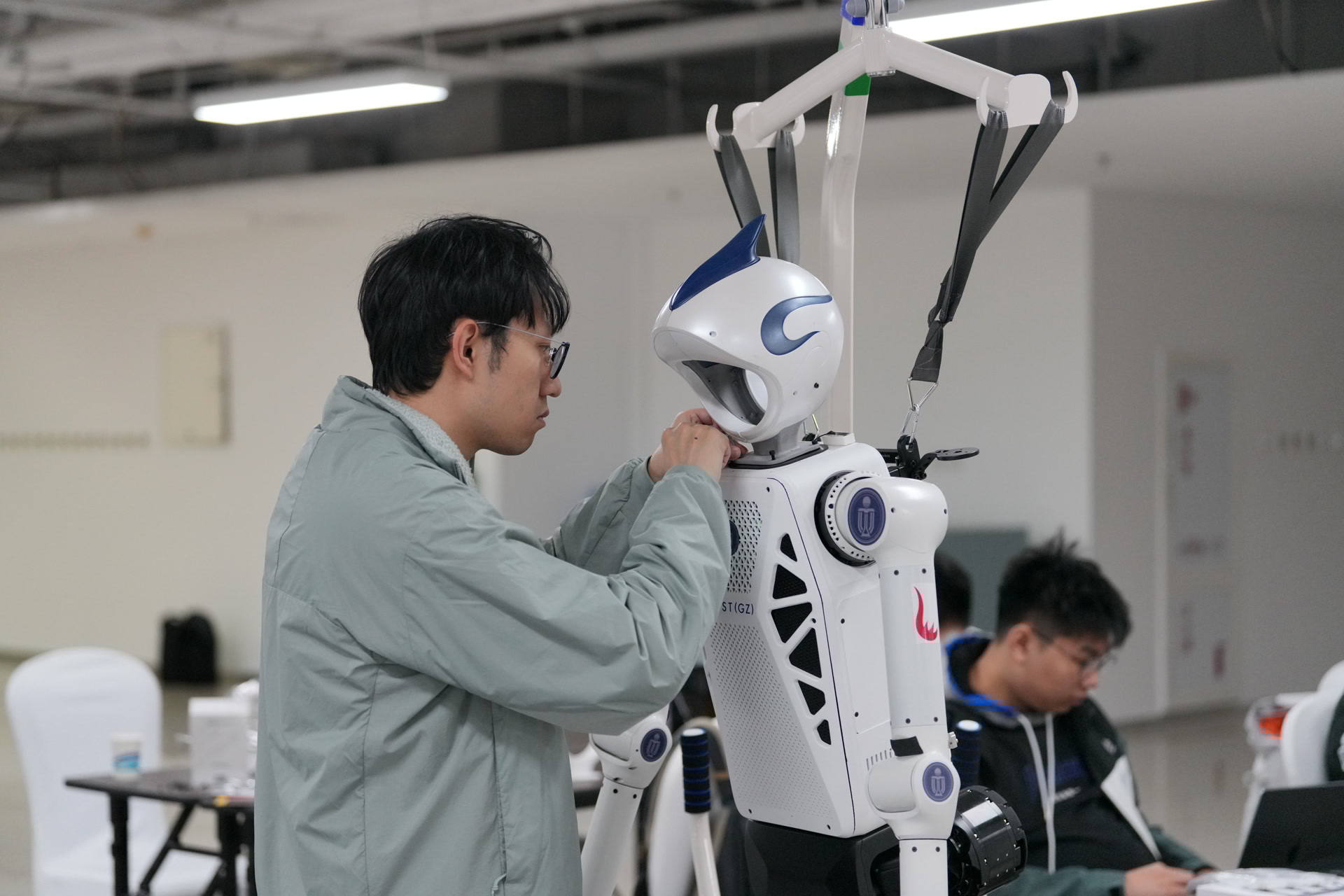 香港科技大学(广州)的工位前,一台机器人格外显眼,头部是一顶蓝白相间的头盔,头盔上还有深蓝色的鳍状“头冠”,科幻感十足。躯干两侧贴着校徽,脚上还套上了一双跑鞋。“外观得让人一眼认出是我们学校的团队。”该校研究助理教授董宸呈笑着指了指机器人介绍,“不光外观美化,我们对算法也进行优化调整。”团队近期正集中攻关一项关键能力,让其摔倒后重新自主站立。“一旦检测到倾覆趋势,我们希望它的手臂和其他关节能协同发力,自己爬起来。”一旁的“00后”队员们盯着测试画面,动作不紧不慢,眼底却压不住第一次参赛的兴奋。