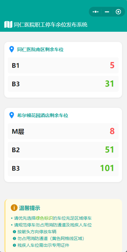 为给医护人员提供高效的停车服务,公司还面向院内职工开发了“职工停车向导”小程序,实时显示剩余车位数量,方便职工日常停车。