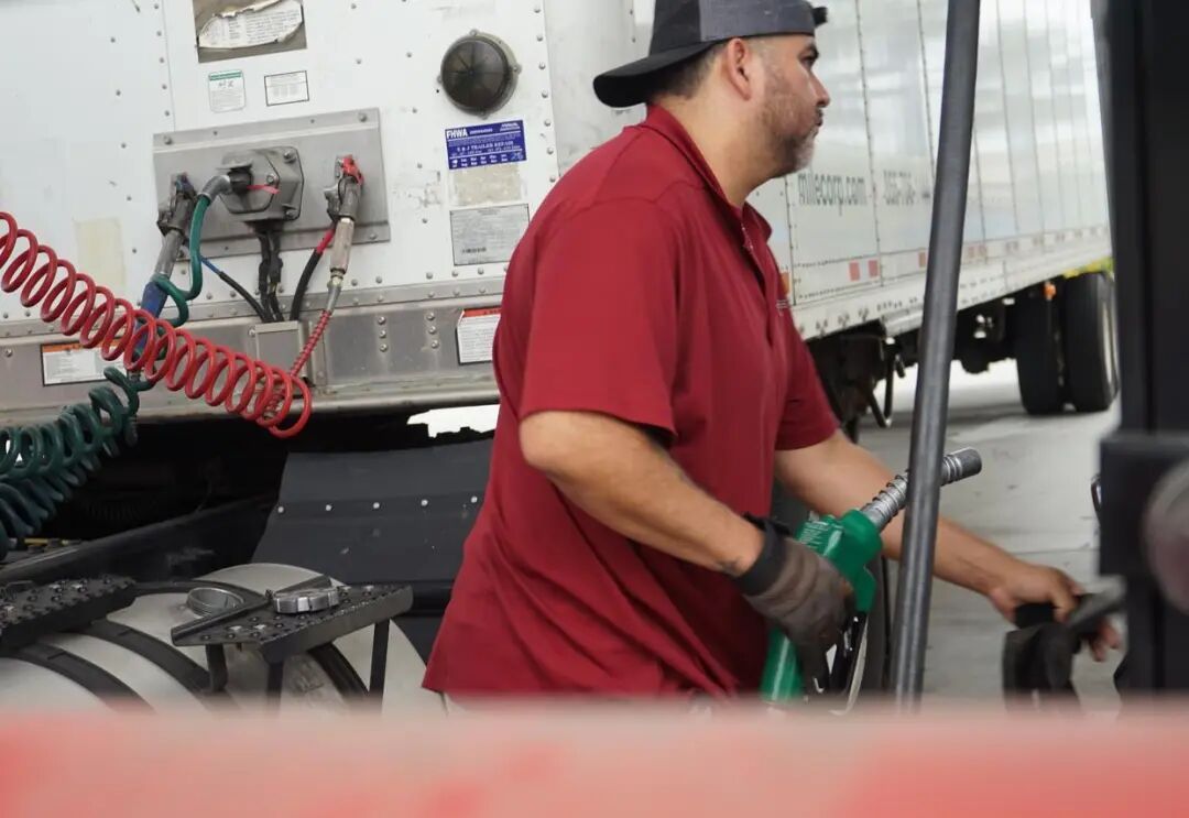 3月31日,在美国加利福尼亚州蒙罗维亚市的一座加油站,司机为卡车加油。新华社发