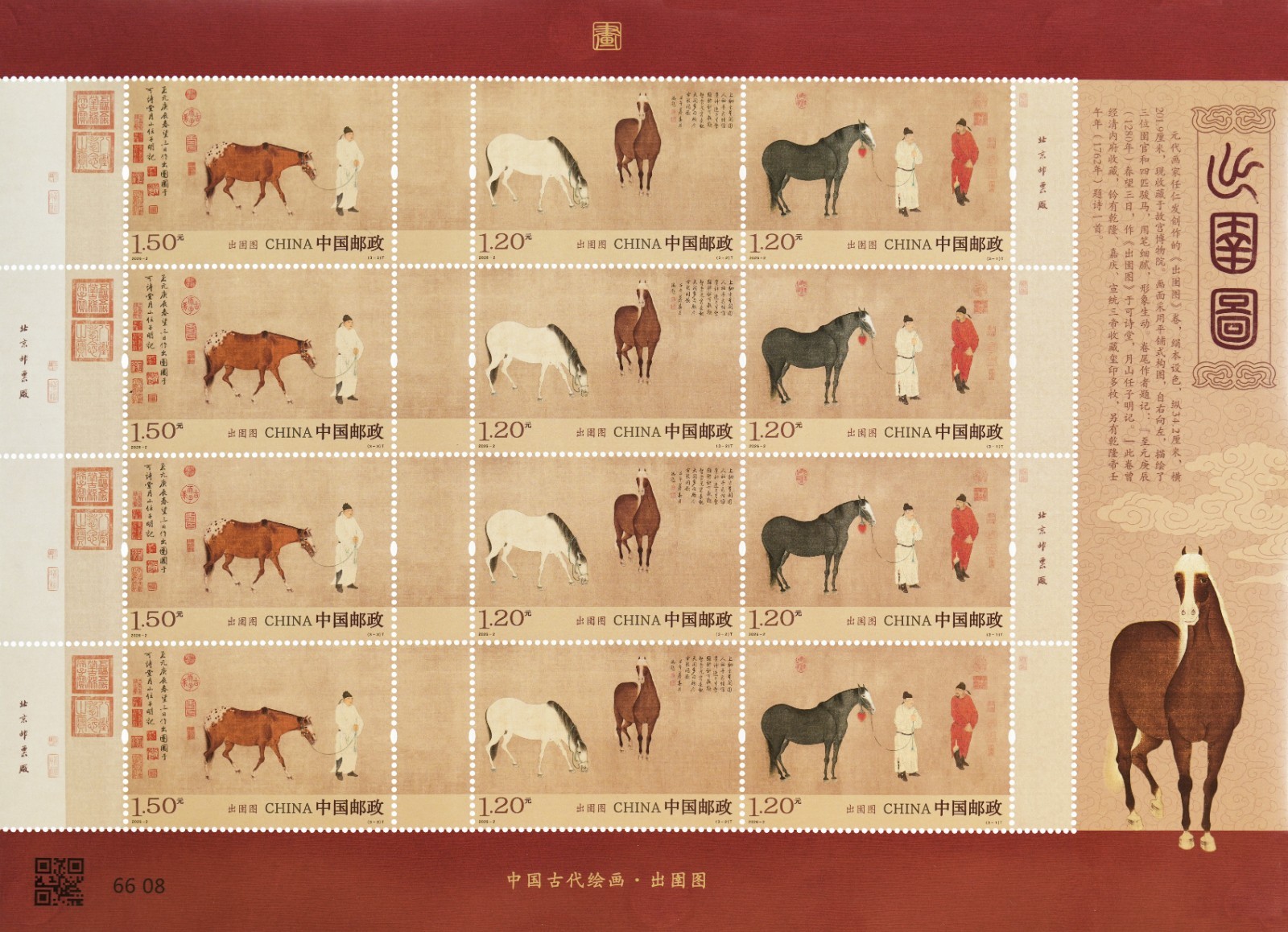 《出圉图》是元代画家任仁发创作的绢本设色画,现藏于故宫博物院。该套邮票在版面构成上,采用古画题材常用的连票设计,以“全出血”的表现方式,加大古画图案面积;采用与古画底图尽量接近的淡赭色细边框,衬以红棕色的面值和图名,与邮票铭记共同置于版面下方,更好地衬托原画古韵、还原古画原貌。在画面处理上,对人物、马匹、印章、文字、绢质底纹等进行分层刻画处理,同时适当提高色彩饱和度;底图采用古画常用的赭黄色调,精准展现古画的色彩层次和墨色的细微变化,色彩雅致协调、层次细腻丰富。邮票大版设计以中国传统的暖棕、朱砂、米黄为边框色调,色彩过渡自然柔和,衬托出原画古朴典雅的独特韵味。右侧昂首的骏马与邮票主题元素相互呼应,强化主题的同时突出视觉焦点。该设计将元代宫廷绘画的笔墨神韵与历史质感精准传递,营造出沉静、厚重的文化氛围,让观者能直观感受古画的艺术张力。