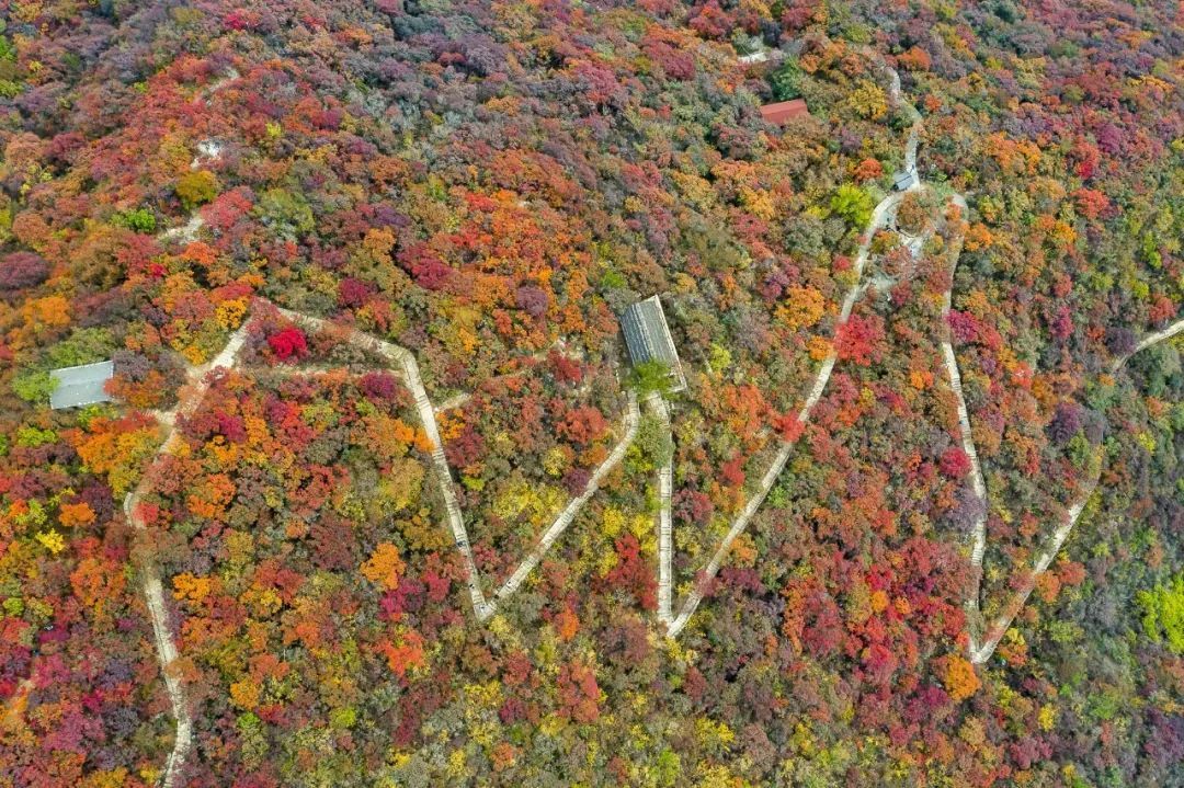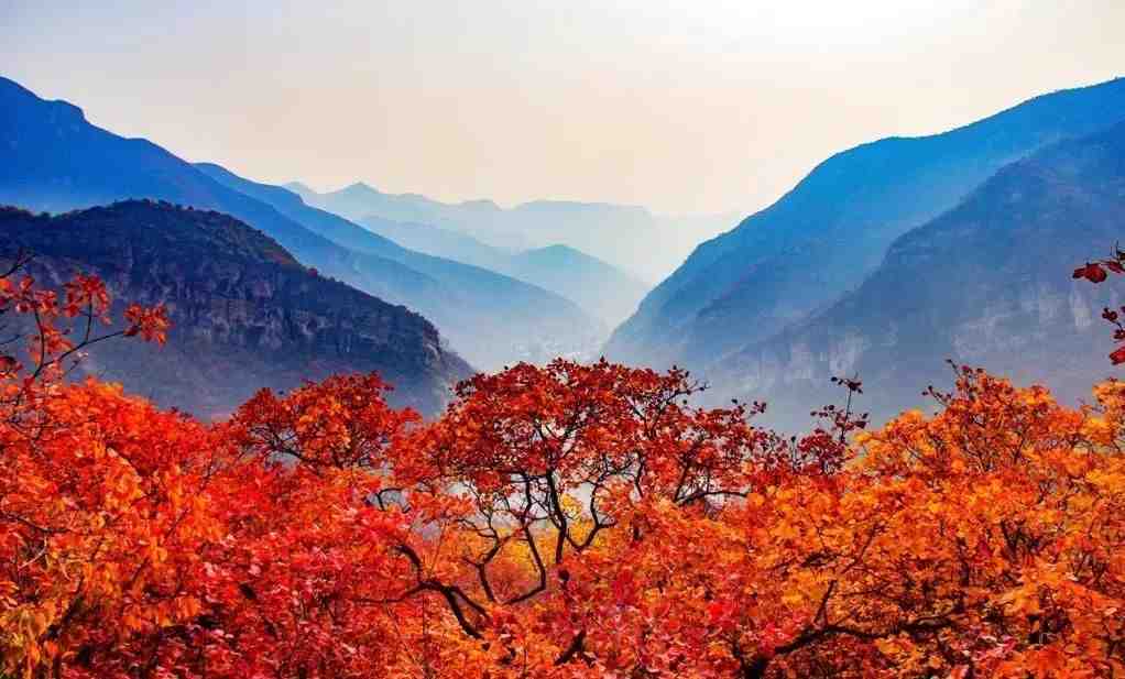 每到秋天,坡峰岭层林尽染,满山的黄栌从黄色到橘红到深红色渐变,大块的色彩嵌在莽莽山谷两侧,如霞似锦。
