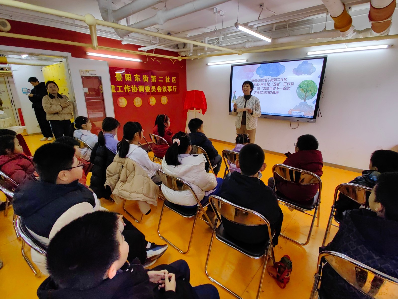 活动中,宋青松结合自身创作经历与艺术感悟,以深入浅出、循循善诱的方式,为孩子们带来一堂生动有趣、干货满满的儿歌歌词创作讲座。课堂上,他从童年记忆、生活观察、情感表达入手,用通俗易懂的语言讲解歌词的结构特点、韵律节奏、意象选用与情感内核,结合经典儿歌、优秀校园歌曲案例,引导孩子们理解文字与音乐的融合、童真与诗意的碰撞、心声与旋律的共鸣。