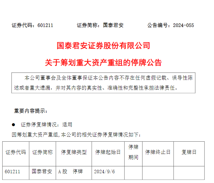 9月5日晚间,国泰君安证券发布关于筹划重大资产重组的停牌公告,公告表示,国泰君安证券与海通证券正在筹划由国泰君安证券通过向海通证券全体A股换股股东发行A股股票、向海通证券全体H股换股股东发行H股股票的方式换股吸收合并海通证券并发行A股股票募集配套资金。