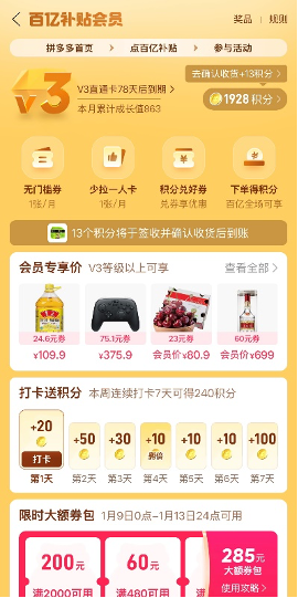 结合年货消费数量多、频次高等特点,拼多多百亿补贴会员积分同样覆盖此次“年货节”活动,使用积分可兑换多面额消费券,68元升级V3会员即可不定时免费领取至高700元大额券包,享6个月无门槛20元券等活动,助力消费者无忧购年货,尽享折上折。