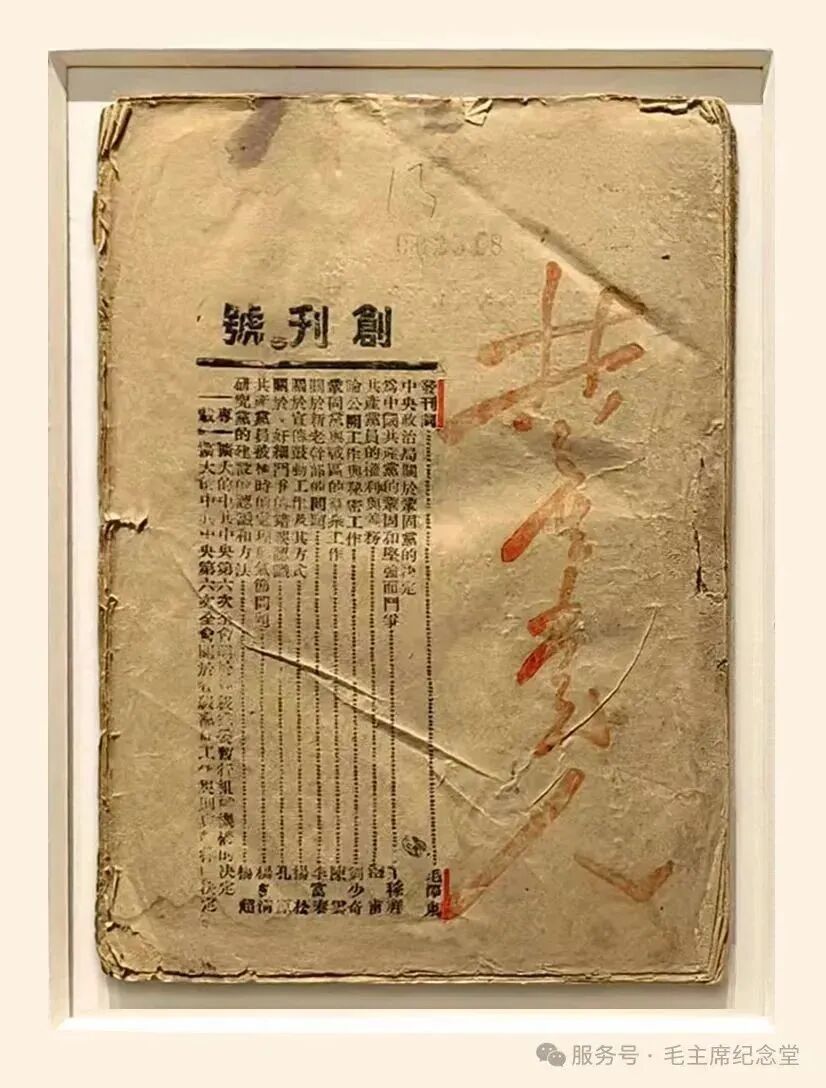 在毛主席纪念堂毛泽东革命业绩纪念室里陈列着一本封面编号为“002518”的铅印本《共产党人》创刊号。长约19厘米,宽约13厘米,封面右侧竖向排列着由毛泽东同志亲笔题写的“共产党人”四个红色大字,左侧印刷的创刊号目录上用钢印盖有一个“密”字。这是我们党在抗战时期的秘密刊物,毛泽东同志将其定位为“专门的党报”。