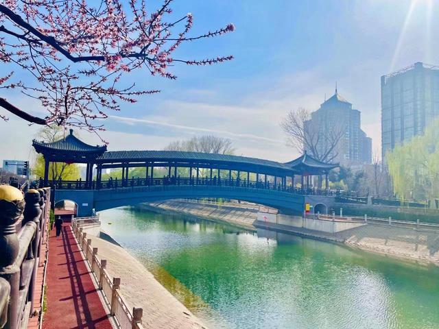 车水马龙的西二环东侧,金中都公园闹中取静。紧邻公园广场东边入口处,一座仿金代建筑风格的廊桥横跨南护城河两岸,桥上廊柱林立,飞檐翘角,韵味十足。伫立桥上,凭栏远眺,脚下是潺潺碧水,四周有桃红柳绿,仿佛置身“半壕春水一城花”的江南。