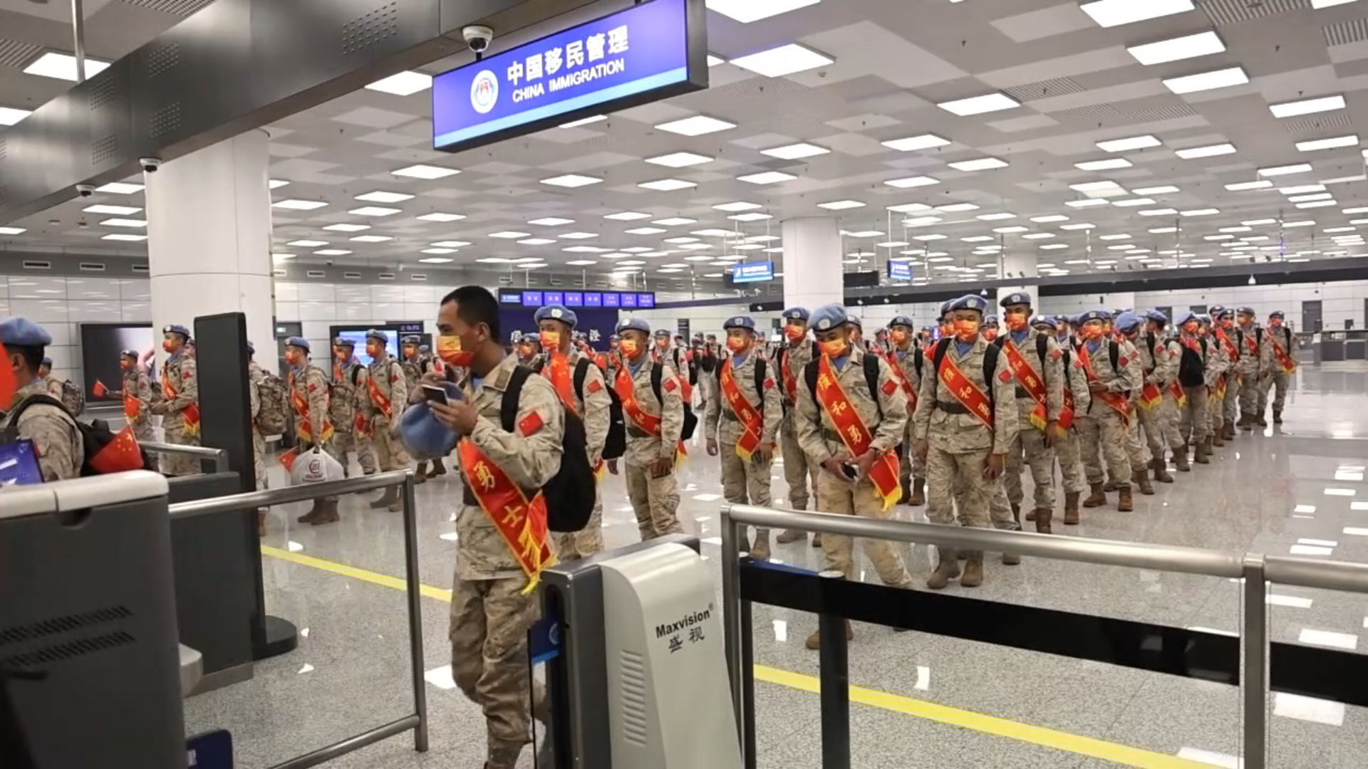 中国第十五批赴南苏丹(瓦乌)维和部队在圆满完成为期一年的维和任务后回国,北京时间12月18日上午,第一梯队164名官兵乘坐包机顺利抵达郑州新郑国际机场。