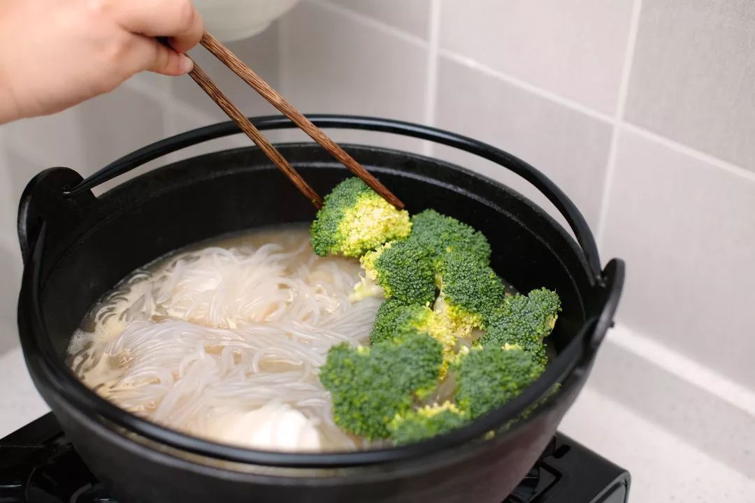 食材处理:粉丝用开水浸泡10分钟。冬笋、白萝卜去皮洗净,锅中坐水加少许油,将冬笋和西兰花一起焯水备用。