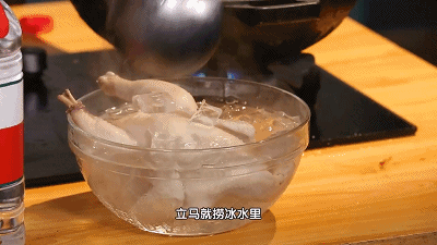 用冰水浸泡,可使鸡肉皮脆肉嫩,鸡肉里的水质也不容易流失