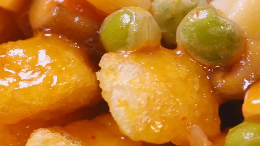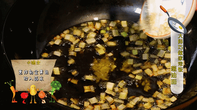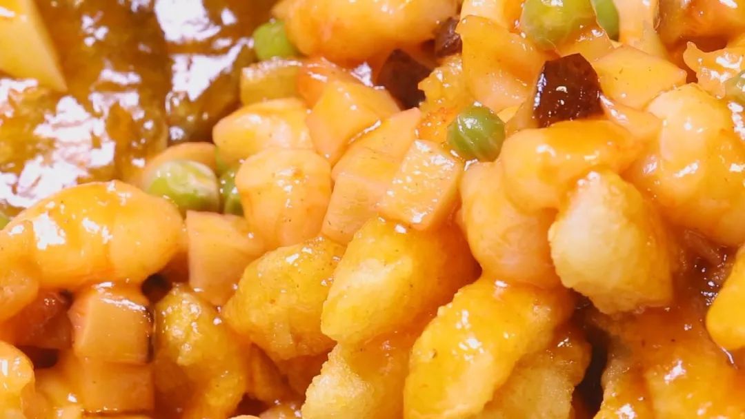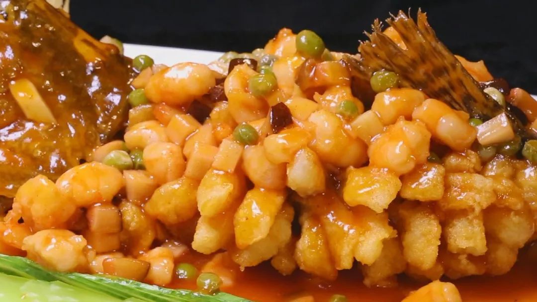 炒汁:番茄酱下锅,加入熟的番茄沙司小火慢炒,炒出红油后加入姜酒,提前焯水完的冬笋丁、冬菇丁,再放入5勺白糖、4克盐、豌豆,最后加5勺白醋、虾仁,勾芡、滴油,将汁浇在桂鱼上即可。