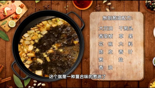 4、制作葱油:将大葱切成小块,下入油锅中炸制金黄,放入蒜末、酱油、陈醋、少许盐、香油调味即可。