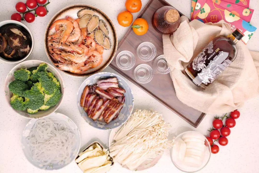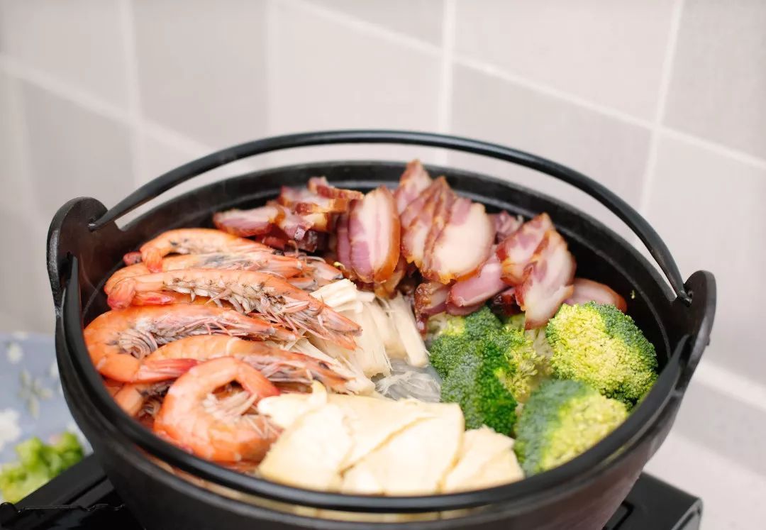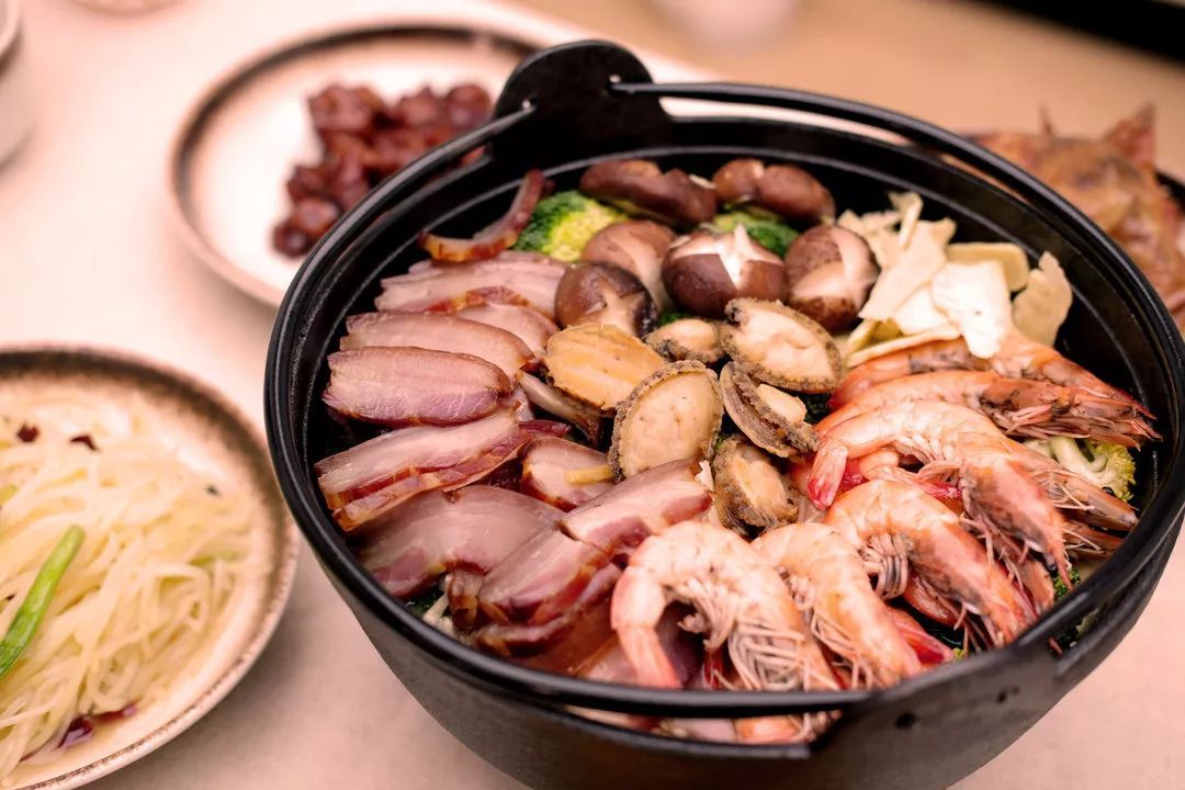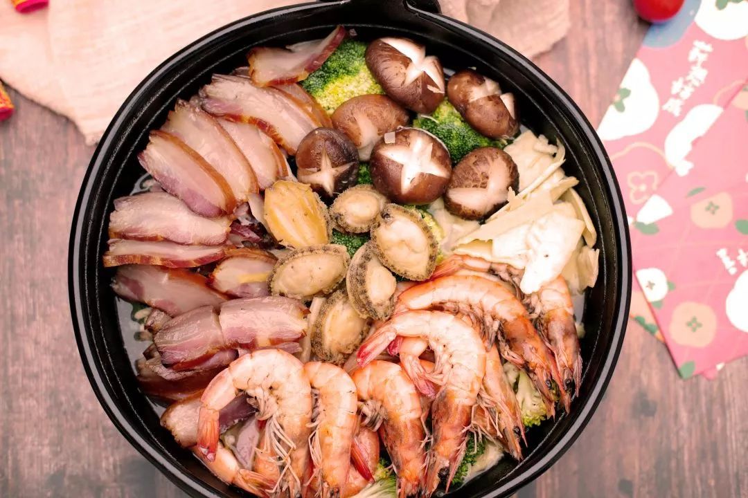 摆放盆菜:将食材依次码入砂锅中,萝卜片、粉丝铺底,中层西兰花、金针菇,表层依次放入大虾、香菇、鲍鱼、腊肉、冬笋等食材。